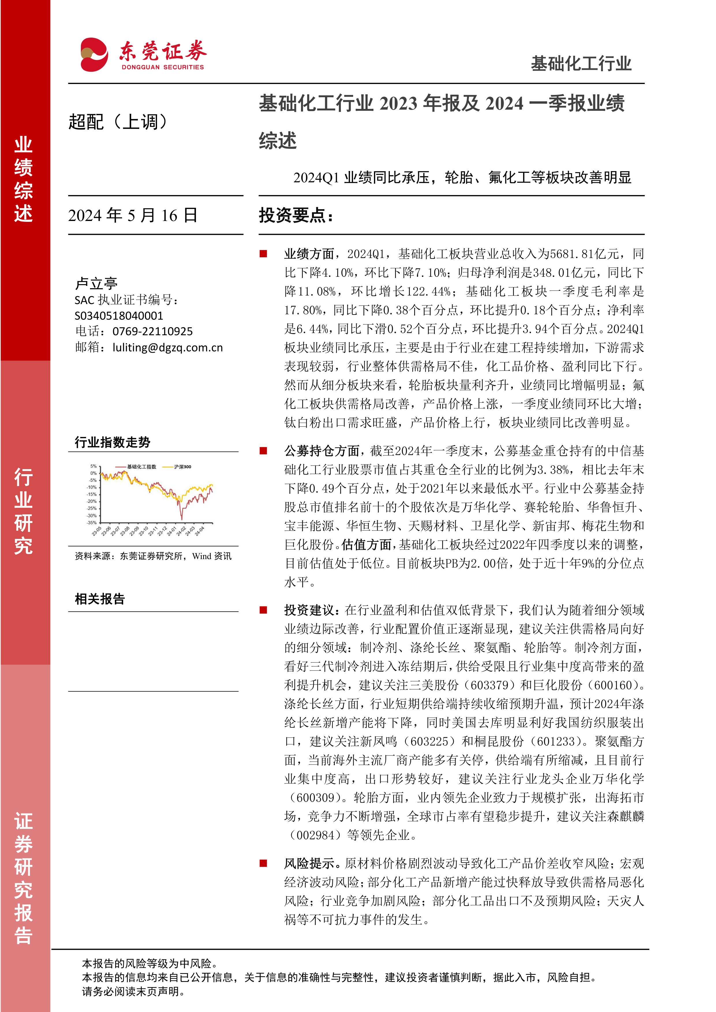 基础化工行业2023年报及2024一季报业绩综述:2024Q1业绩同比承压,轮胎、氟化工等板块改善明显