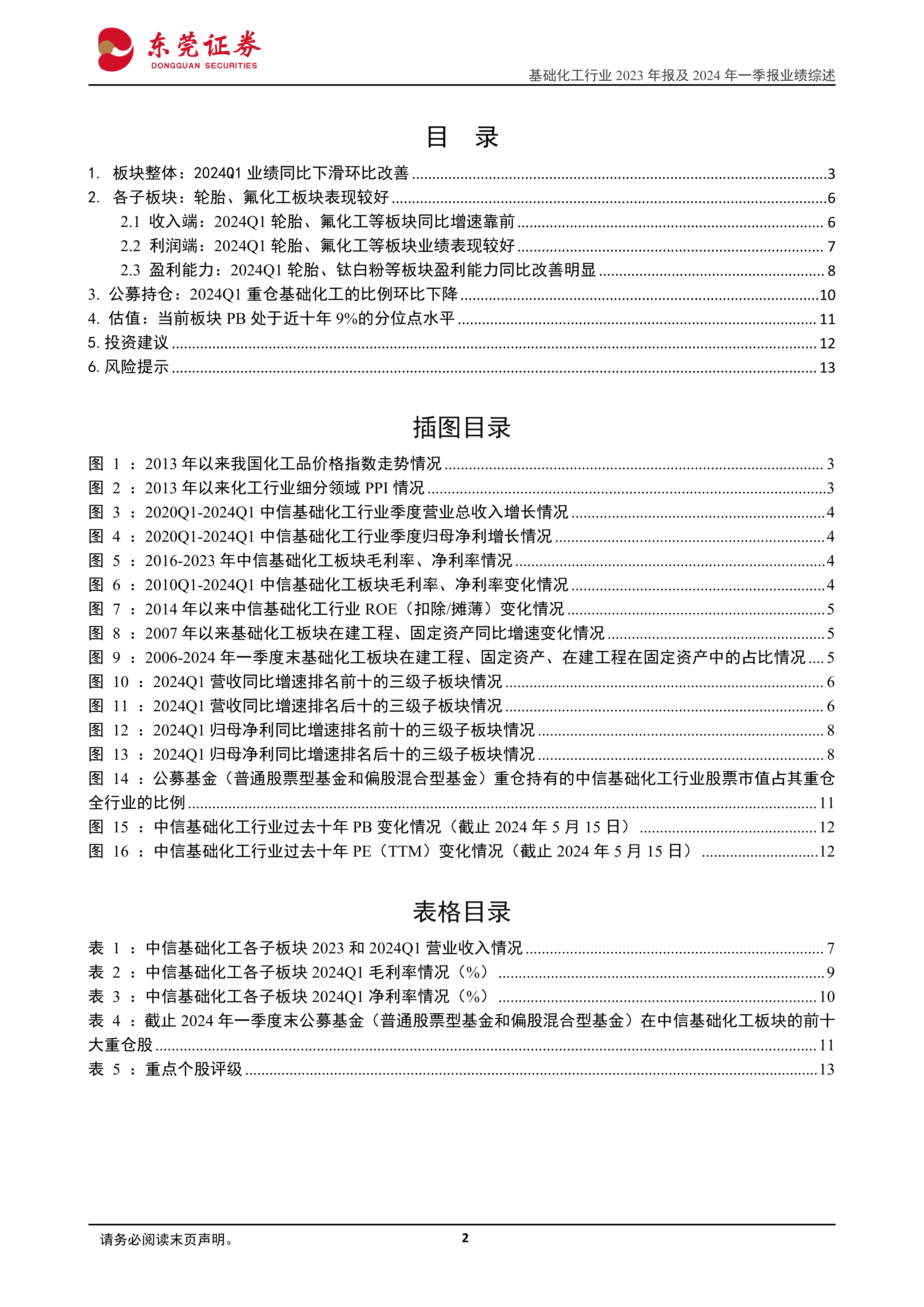 风险提示。原材料价格剧烈波动导致化工产品价差收窄风险;宏观经济波动风险;部分化工产品新增产能过快释放导致供需格局恶化风险;行业竞争加剧风险;部分化工品出口不及预期风险;天灾人祸等不可抗力事件的发生。