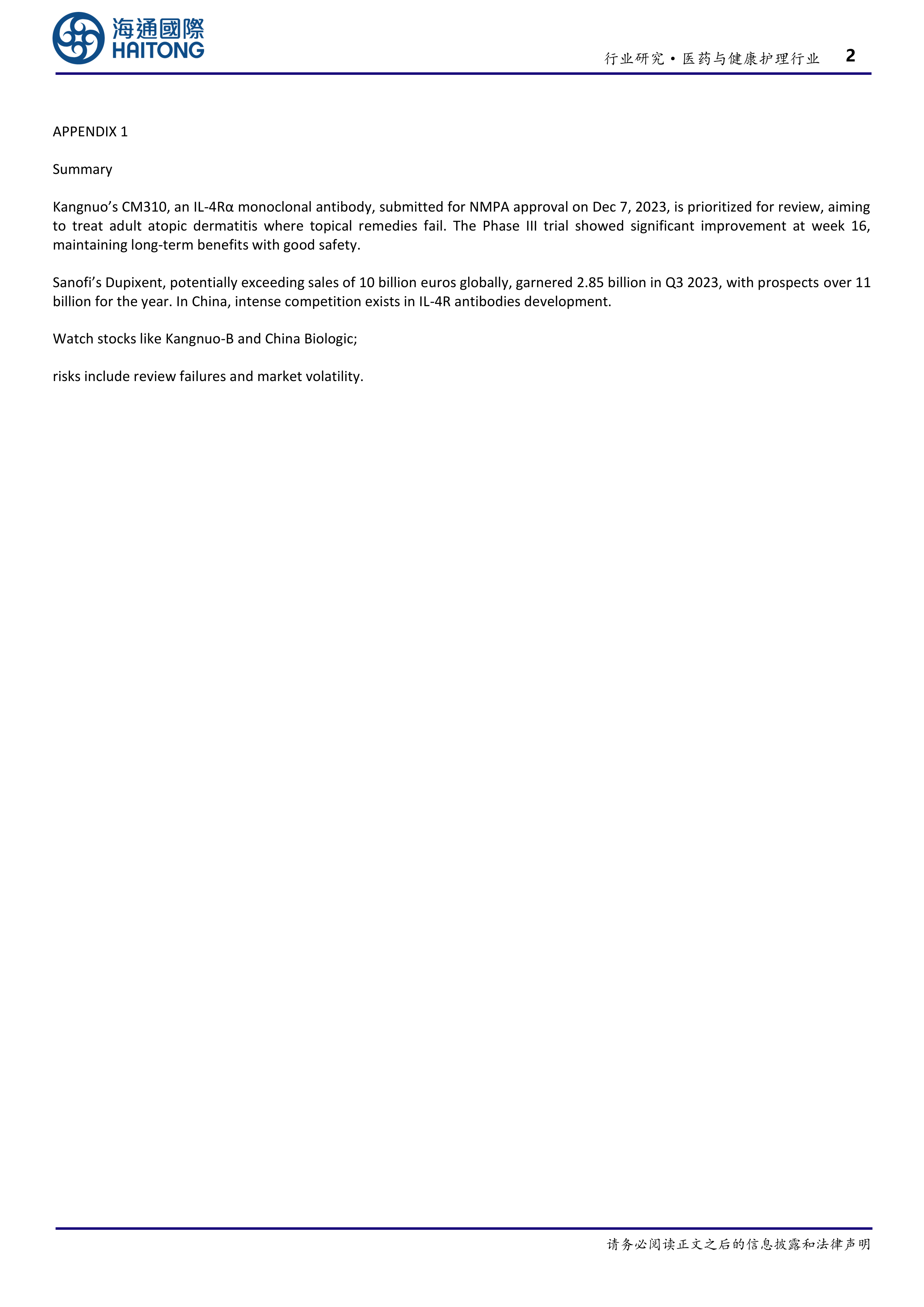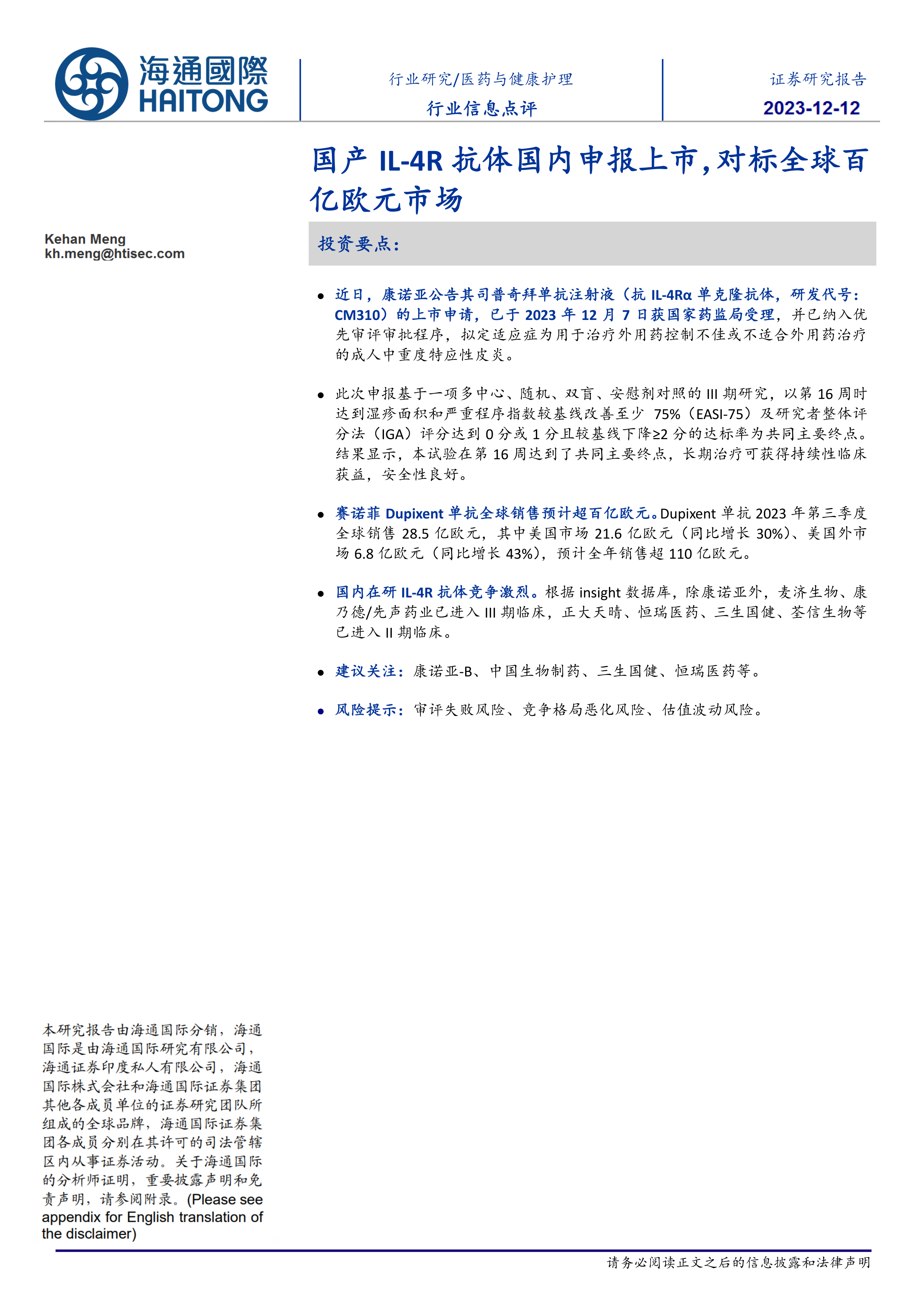 医药与健康护理行业信息点评:国产IL-4R抗体国内申报上市,对标全球百亿欧元市场
