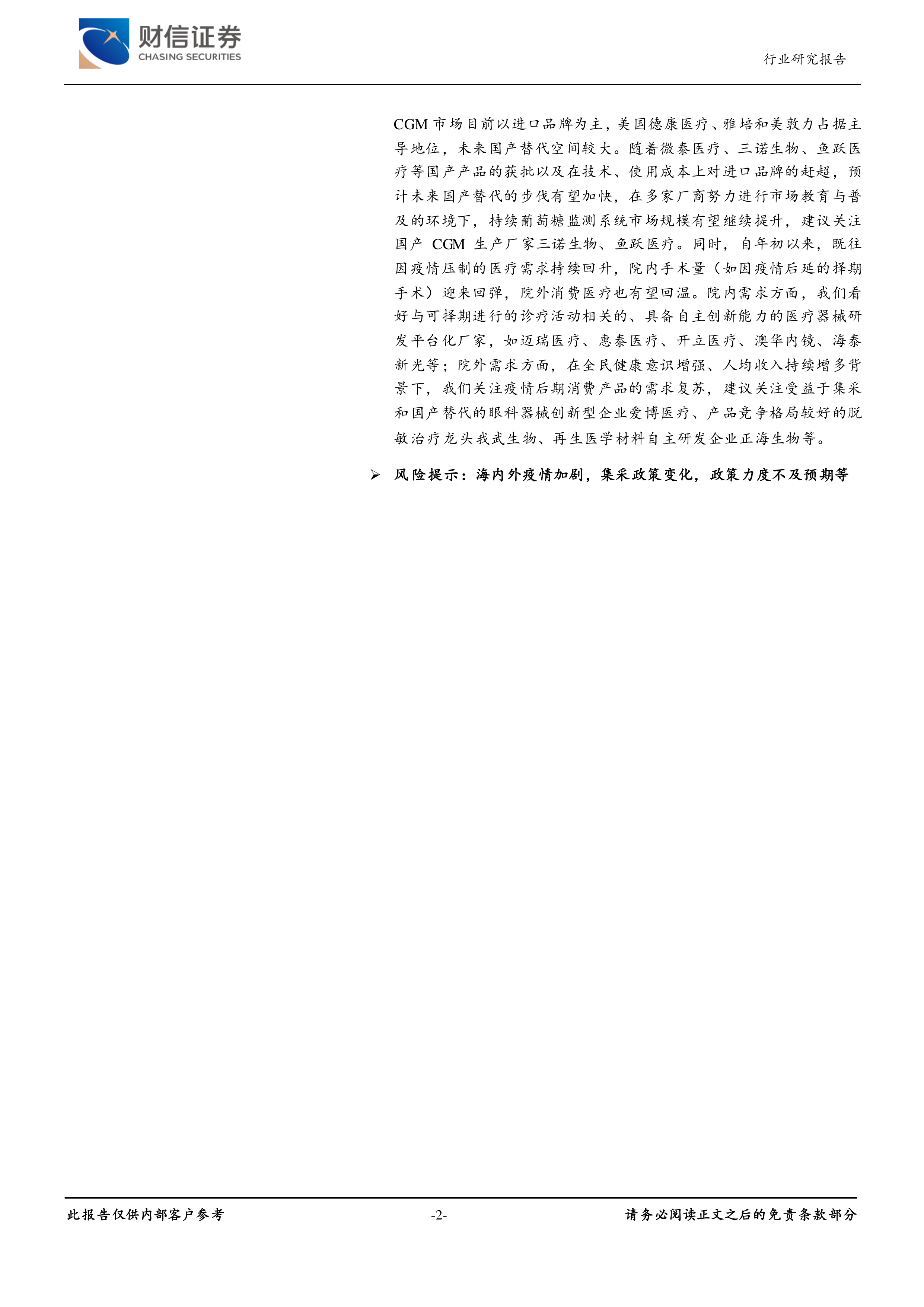 投资建议:我国糖尿病发病率及患者人数持续增加,持续葡萄糖监测系统渗透正在加速,我国持续葡萄糖监测市场起步相对较晚,中国CGM市场目前以进口品牌为主,美国德康医疗、雅培和美敦力占据主导地位,未来国产替代空间较大。随着微泰医疗、三诺生物、鱼跃医疗等国产产品的获批以及在技术、使用成本上对进口品牌的赶超,预计未来国产替代的步伐有望加快,在多家厂商努力进行市场教育与普及的环境下,持续葡萄糖监测系统市场规模有望继续提升,建议关注国产CGM生产厂家三诺生物、鱼跃医疗。同时,自年初以来,既往因疫情压制的医疗需求持续回升,院内手术量(如因疫情后延的择期手术)迎来回弹,院外消费医疗也有望回温。院内需求方面,我们看好与可择期进行的诊疗活动相关的、具备自主创新能力的医疗器械研发平台化厂家,如迈瑞医疗、惠泰医疗、开立医疗、澳华内镜、海泰新光等;院外需求方面,在全民健康意识增强、人均收入持续增多背景下,我们关注疫情后期消费产品的需求复苏,建议关注受益于集采和国产替代的眼科器械创新型企业爱博医疗、产品竞争格局较好的脱敏治疗龙头我武生物、再生医学材料自主研发企业正海生物等。