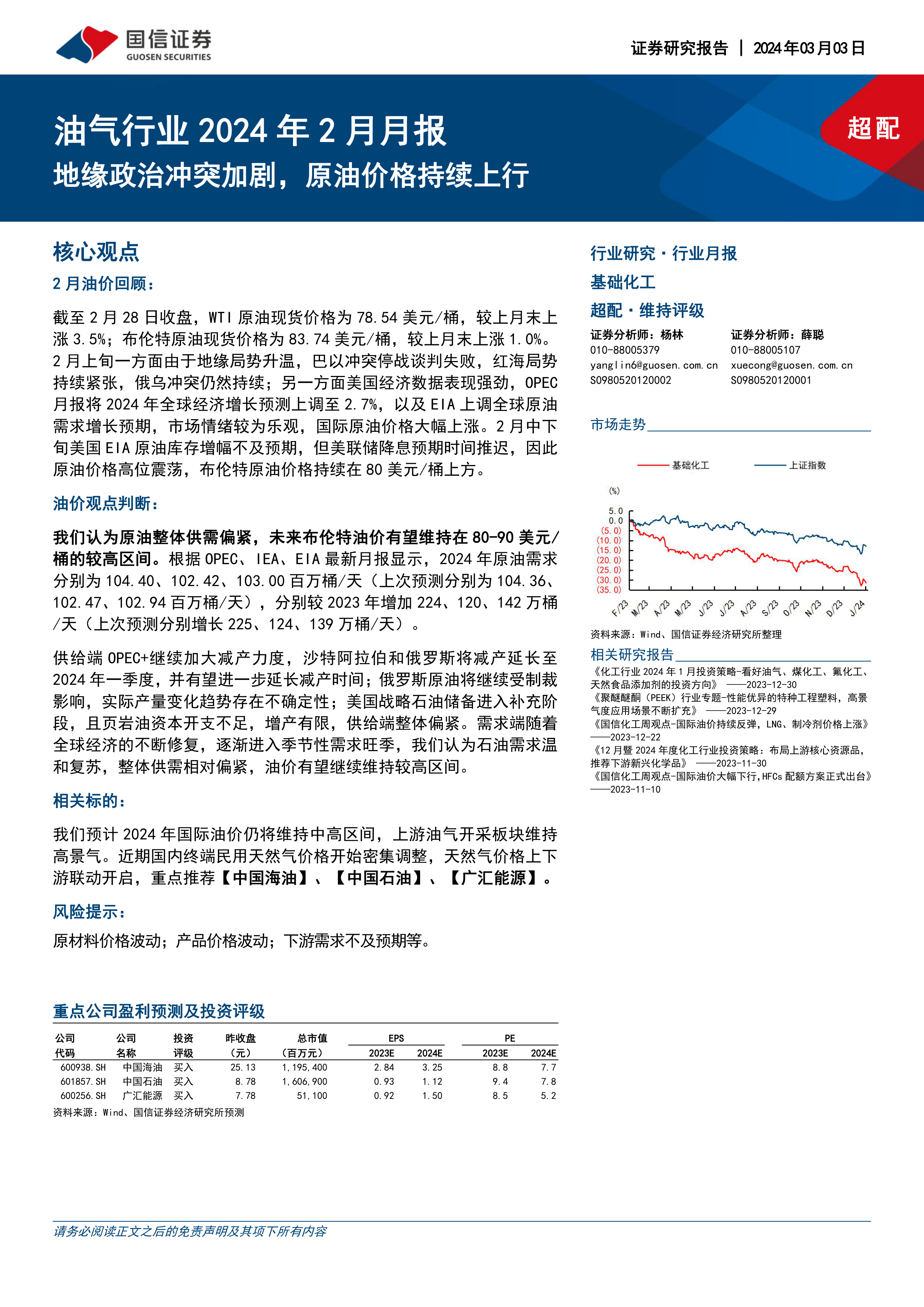 油气行业2024年2月月报:地缘政治冲突加剧,原油价格持续上行