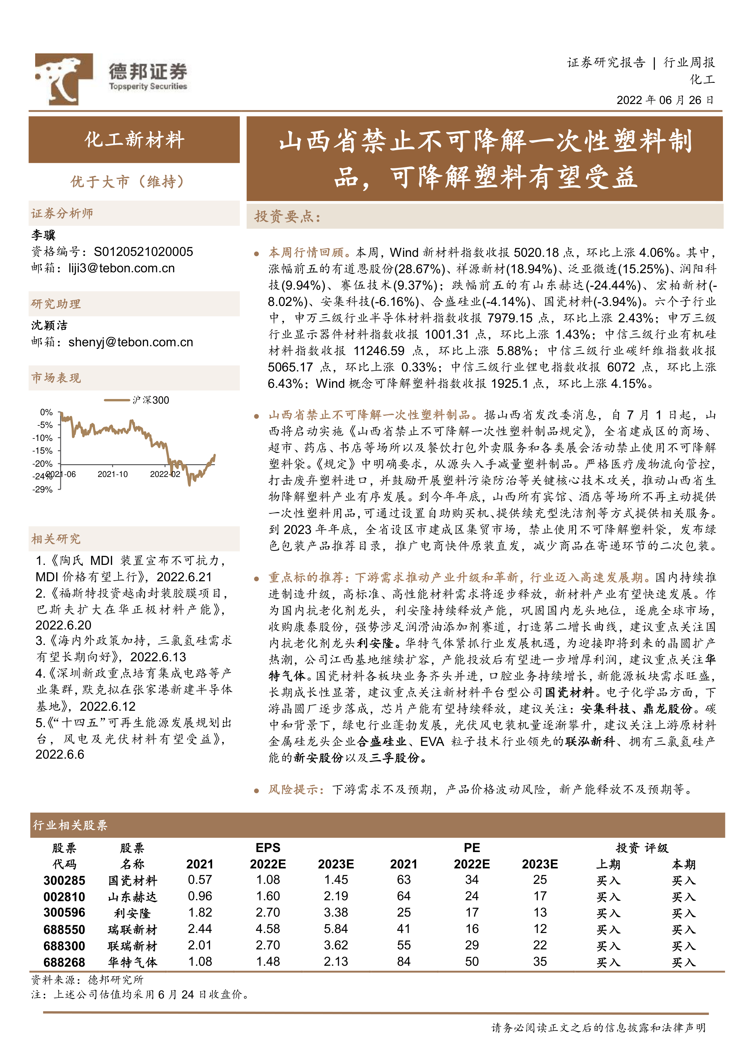 重点标的推荐: 下游需求推动产业升级和革新,行业迈入高速发展期。 国内持续推进制造升级,高标准、高性能材料需求将逐步释放,新材料产业有望快速发展。 作为国内抗老化剂龙头,利安隆持续释放产能, 巩固国内龙头地位, 逐鹿全球市场,收购康泰股份, 强势涉足润滑油添加剂赛道, 打造第二增长曲线, 建议重点关注国内抗老化剂龙头利安隆。 华特气体紧抓行业发展机遇, 为迎接即将到来的晶圆扩产热潮,公司江西基地继续扩容,产能投放后有望进一步增厚利润, 建议重点关注华特气体。 国瓷材料各板块业务齐头并进, 口腔业务持续增长,新能源板块需求旺盛,长期成长性显著,建议重点关注新材料平台型公司国瓷材料。 电子化学品方面,下游晶圆厂逐步落成,芯片产能有望持续释放,建议关注: 安集科技、鼎龙股份。 碳中和背景下,绿电行业蓬勃发展,光伏风电装机量逐渐攀升,建议关注上游原材料金属硅龙头企业合盛硅业、 EVA 粒子技术行业领先的联泓新科、拥有三氯氢硅产能的新安股份以及三孚股份。