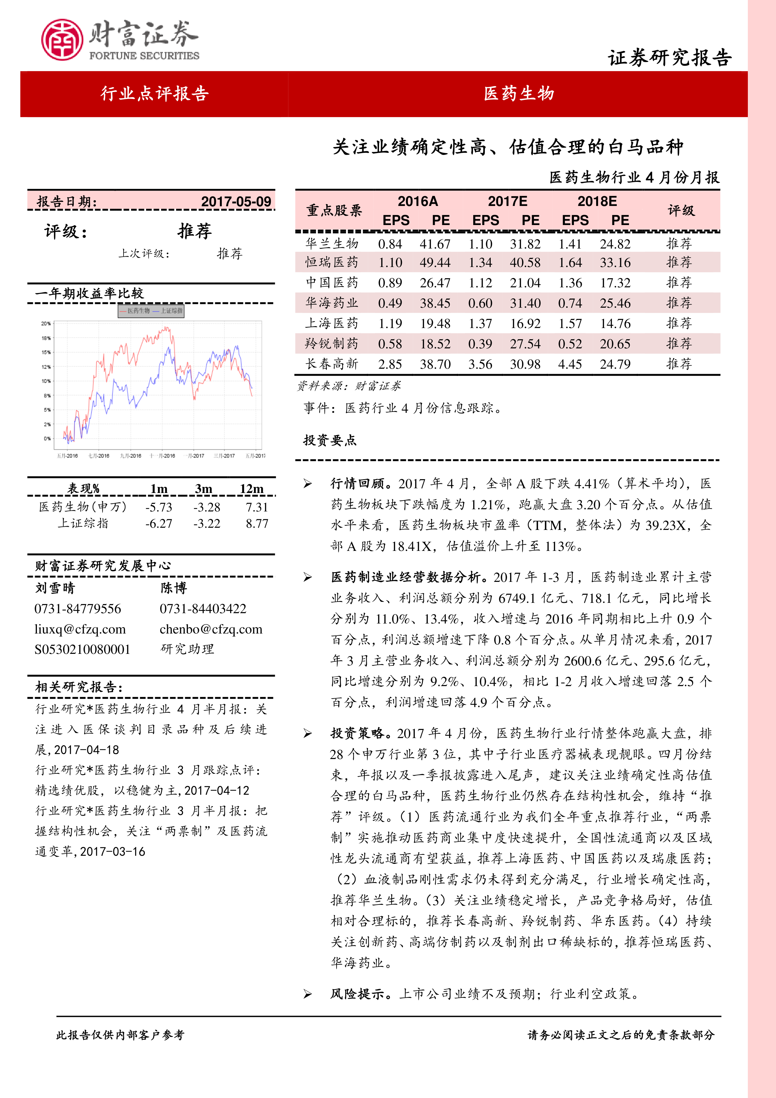 医药生物行业4月份月报:关注业绩确定性高、估值合理的白马品种