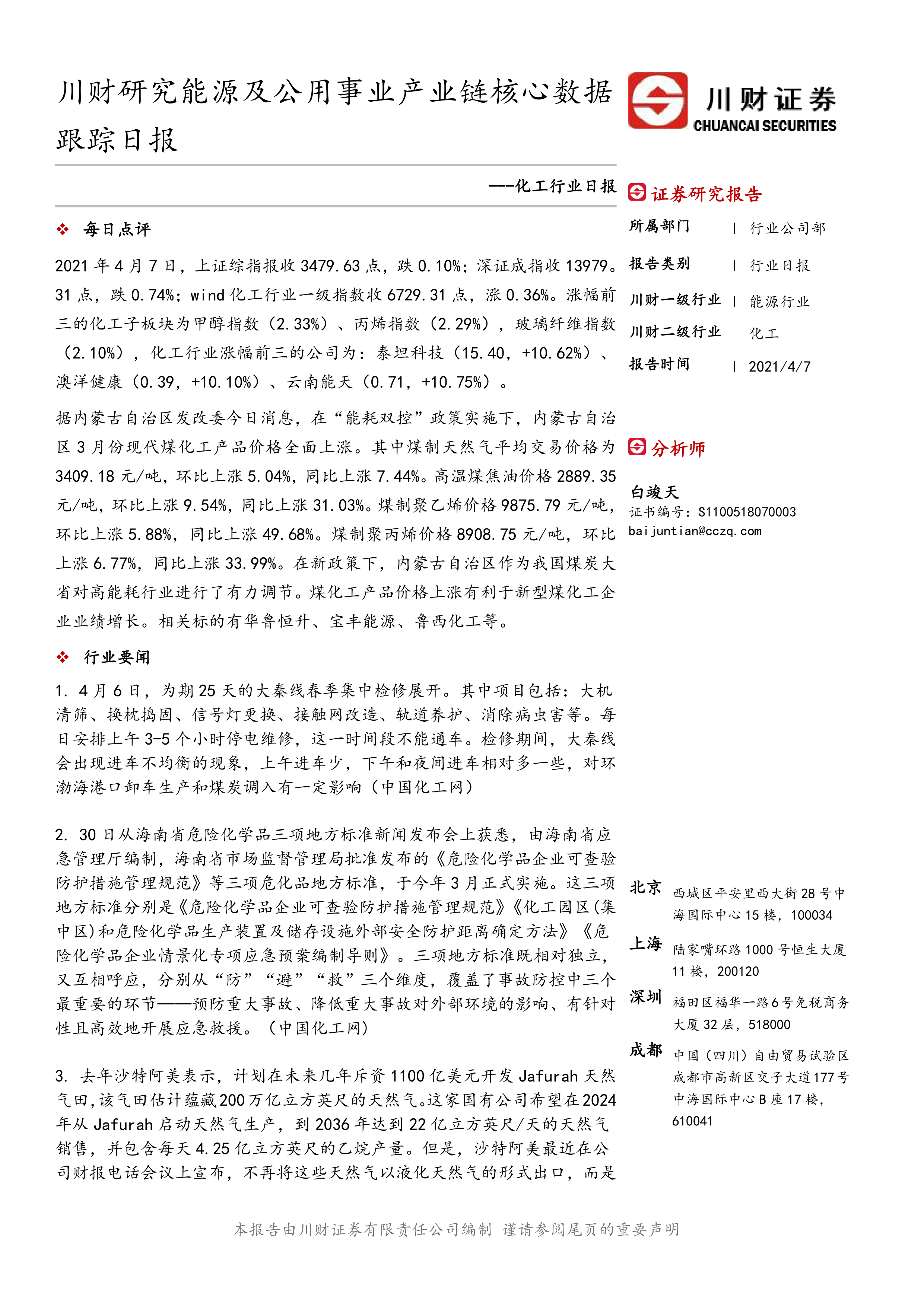 化工行业:川财研究能源及公用事业产业链核心数据跟踪日报