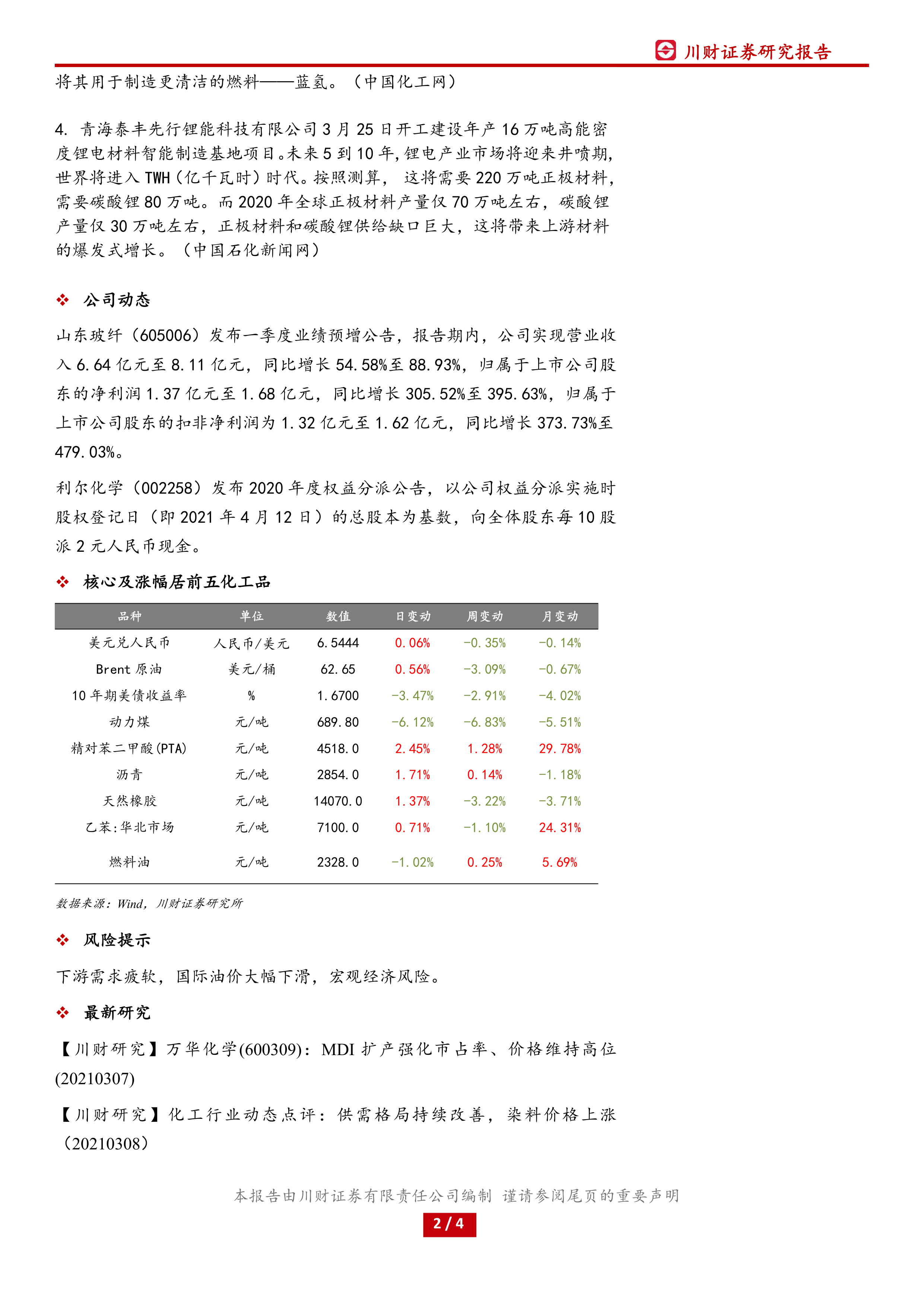 2021年4月7日,上证综指报收3479.63点,跌0.10%;深证成指收13979。31点,跌0.74%;wind化工行业一级指数收6729.31点,涨0.36%。涨幅前三的化工子板块为甲醇指数(2.33%)、丙烯指数(2.29%),玻璃纤维指数(2.10%),化工行业涨幅前三的公司为:泰坦科技(15.40,+10.62%)、澳洋健康(0.39,+10.10%)、云南能天(0.71,+10.75%)。