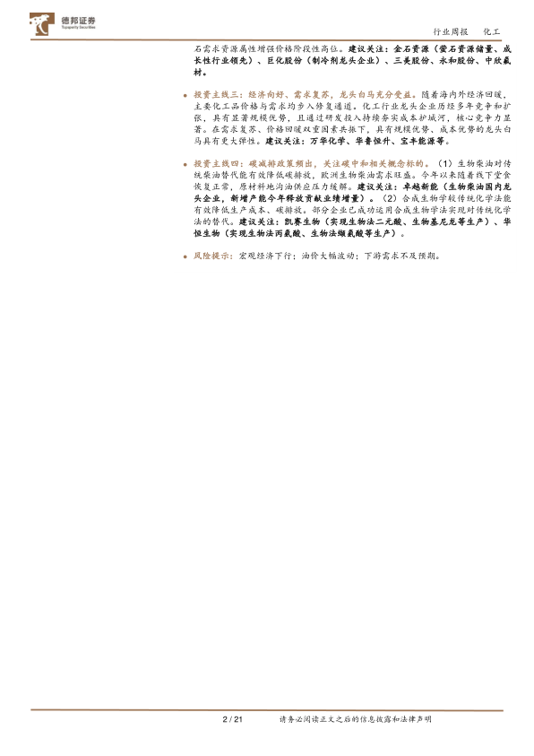 投资主线三:经济向好、需求复苏,龙头白马充分受益。随着海内外经济回暖,主要化工品价格与需求均步入修复通道。化工行业龙头企业历经多年竞争和扩张,具有显著规模优势,且通过研发投入持续夯实成本护城河,核心竞争力显著。在需求复苏、价格回暖双重因素共振下,具有规模优势、成本优势的龙头白马具有更大弹性。建议关注:万华化学、华鲁恒升、宝丰能源等。