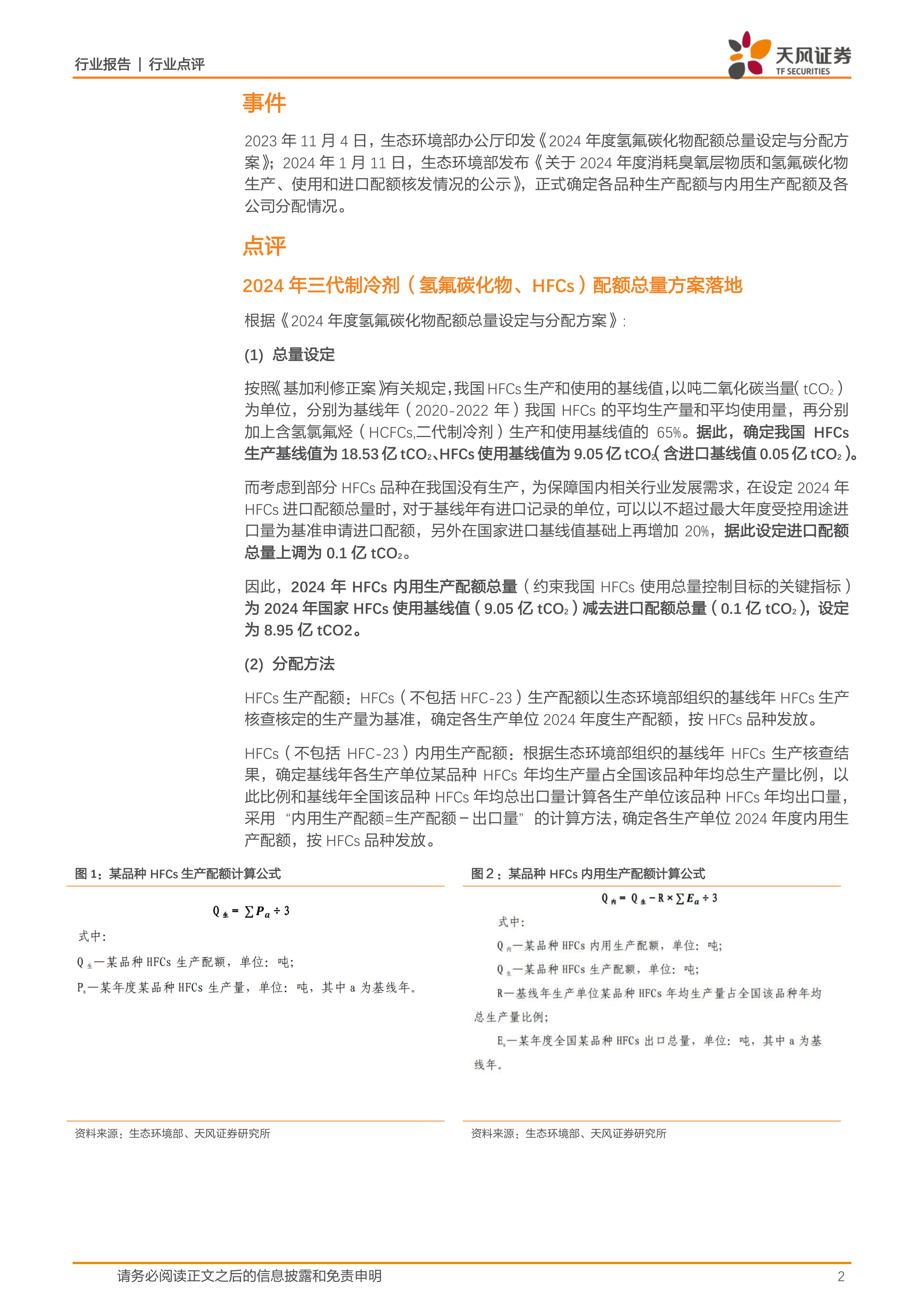 2023年11月4日,生态环境部办公厅印发《2024年度氢氟碳化物配额总量设定与分配方案》,对配额总量进行设定,并确定了配额总量的分配方案。2024年2024年1月11日,生态环境部发布了《关于2024年度消耗臭氧层物质和氢氟碳化物生产、使用和进口配额核发情况的公示》,正式确定各品种生产配额与内用生产配额,以及上述配额在34家公司中的分配情况。