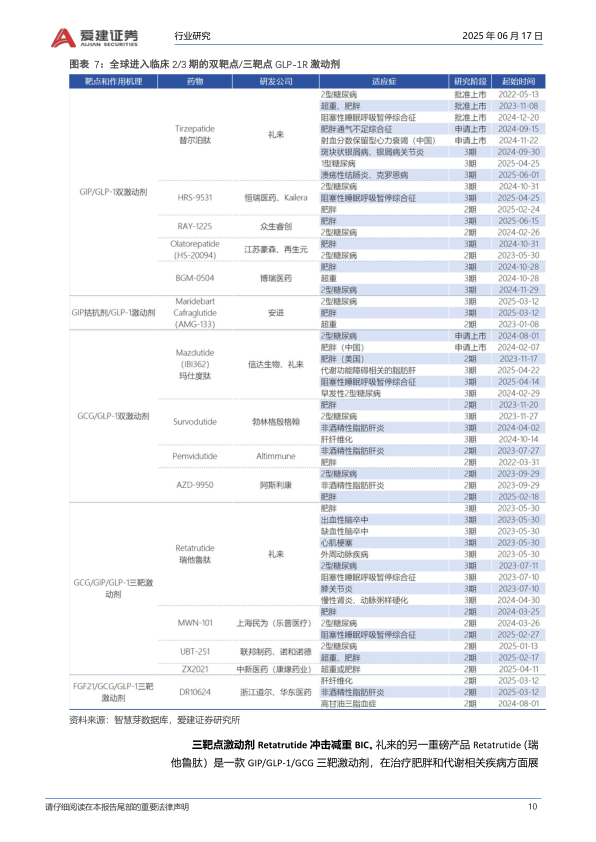 ADA2025蓄势待发,关注减肥药产业链投资机会。第85届美国糖尿病协会(ADA)科学会议将于6月20-23日在美国芝加哥举行,ADA科学会议是全球糖尿病领域最具影响力的年度学术盛会之一。GLP-1激动剂仍是目前研究热点,中国药企也是围绕GLP-1靶点的痛点进行差异化创新,包括长效化GLP-1激动剂、口服小分子GLP-1激动剂、双靶/三靶GLP-1激动剂、以及增肌减重新机制等方向。ADA2025大会上值得关注的产业催化剂:1)减肥增肌:后GLP-1时代的潜力赛道,礼来将公布Bimagrumab单抗的二期研究数据,来凯医药将公布LAE102的首次人体临床数据,以及另外三款ActRII药物的临床前研究数据;2)双靶/三靶GLP-1激动剂:众生药业RAY-1225和博瑞医药BGM-0504都将公布减重和降糖适应症的二期临床数据;3)口服小分子GLP-1激动剂:礼来将公布Orforglipron三期临床ACHIEVE-1(降糖研究)结果。