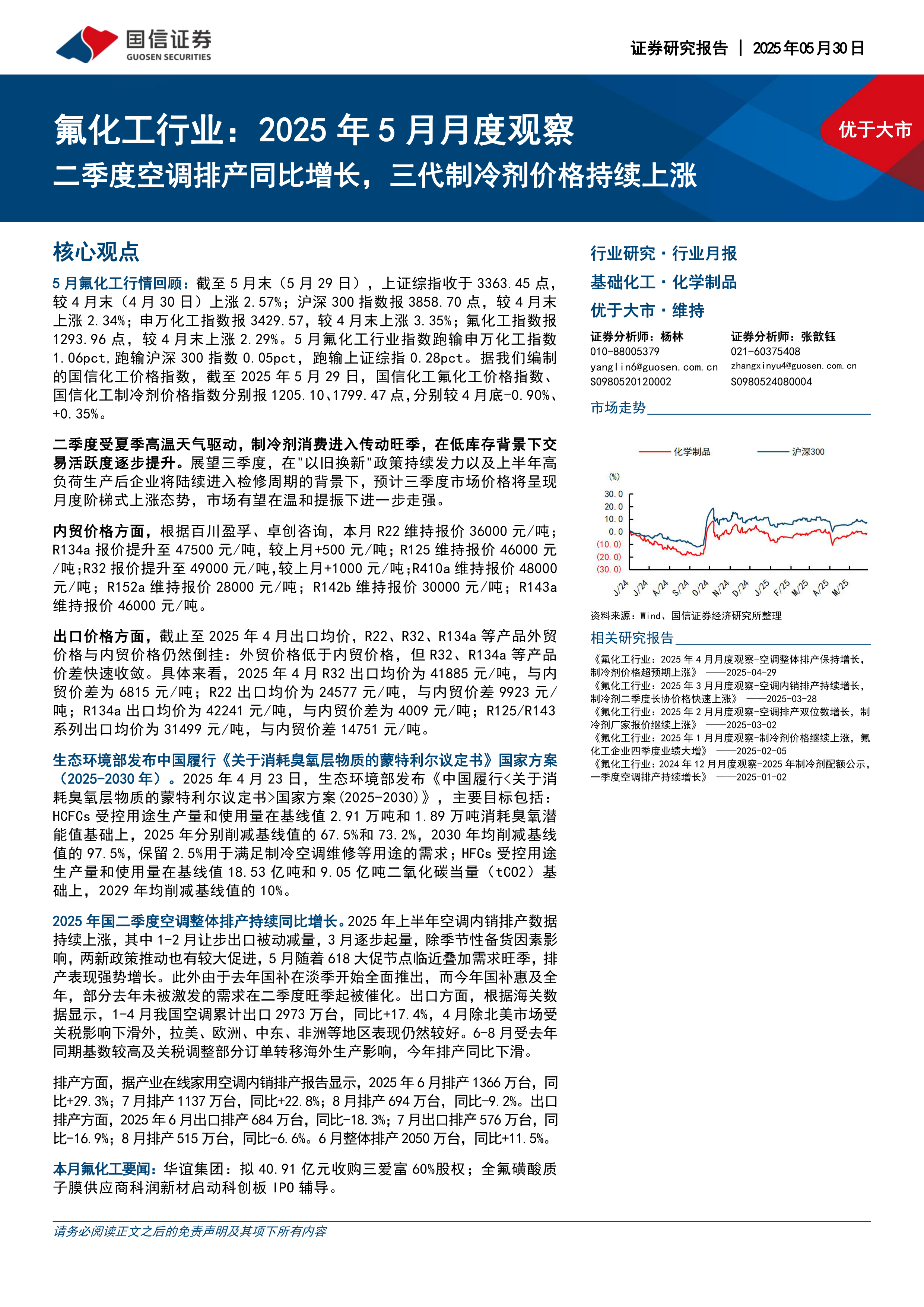 氟化工行业:2025年5月月度观察:二季度空调排产同比增长,三代制冷剂价格持续上涨