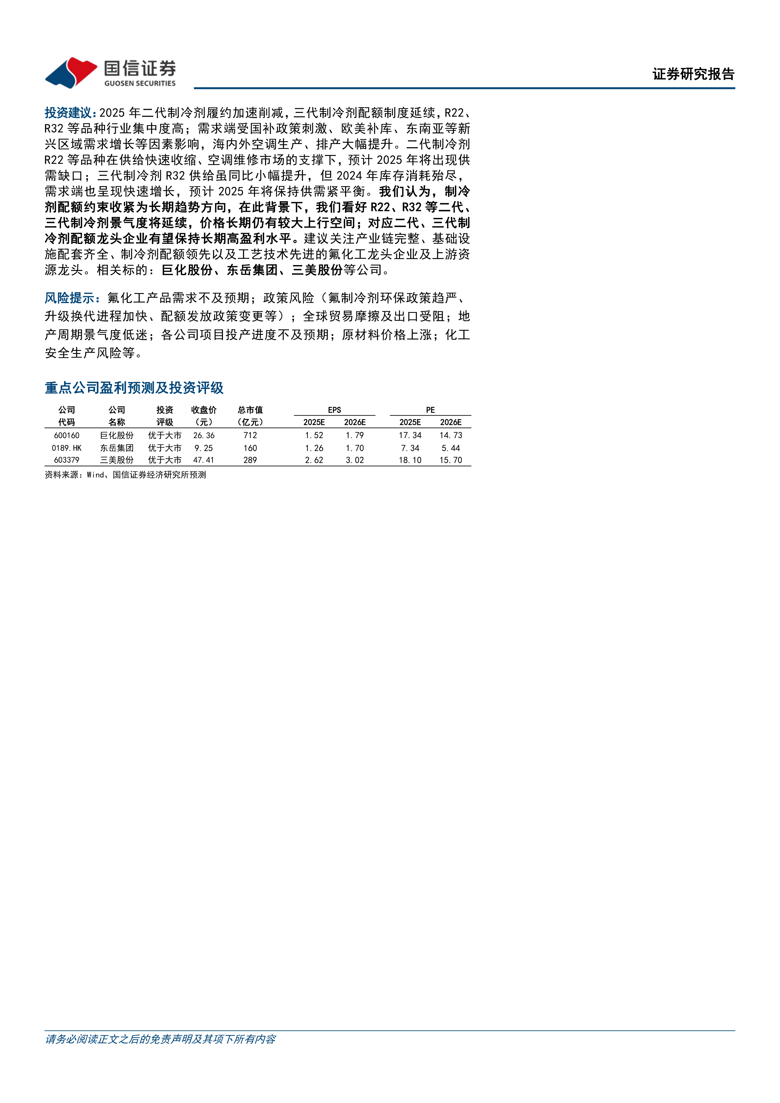 投资建议:2025年二代制冷剂履约加速削减,三代制冷剂配额制度延续,R22、R32等品种行业集中度高;需求端受国补政策刺激、欧美补库、东南亚等新兴区域需求增长等因素影响,海内外空调生产、排产大幅提升。二代制冷剂R22等品种在供给快速收缩、空调维修市场的支撑下,预计2025年将出现供需缺口;三代制冷剂R32供给虽同比小幅提升,但2024年库存消耗殆尽,需求端也呈现快速增长,预计2025年将保持供需紧平衡。我们认为,制冷剂配额约束收紧为长期趋势方向,在此背景下,我们看好R22、R32等二代、三代制冷剂景气度将延续,价格长期仍有较大上行空间;对应二代、三代制冷剂配额龙头企业有望保持长期高盈利水平。建议关注产业链完整、基础设施配套齐全、制冷剂配额领先以及工艺技术先进的氟化工龙头企业及上游资源龙头。相关标的:巨化股份、东岳集团、三美股份等公司。