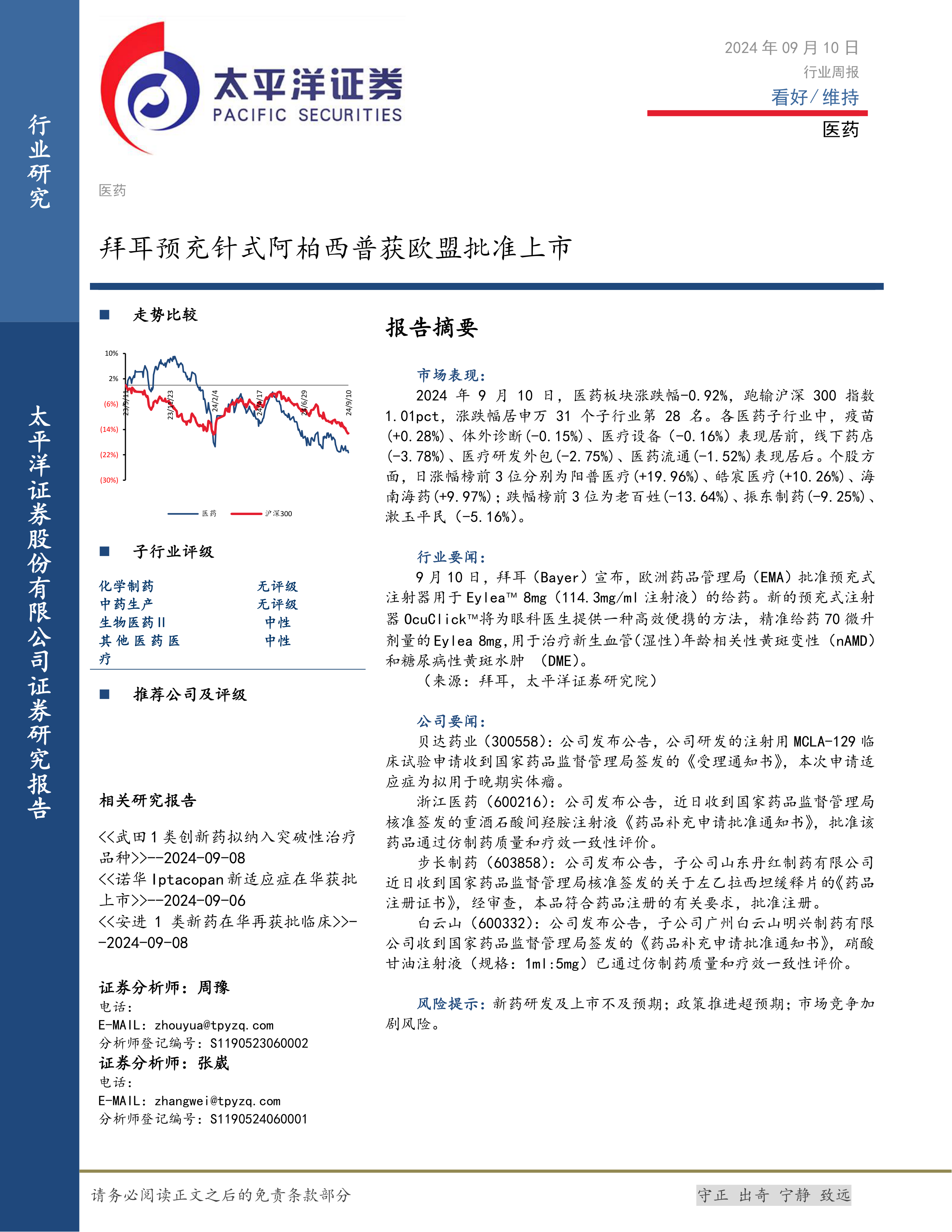医药行业周报:拜耳预充针式阿柏西普获欧盟批准上市
