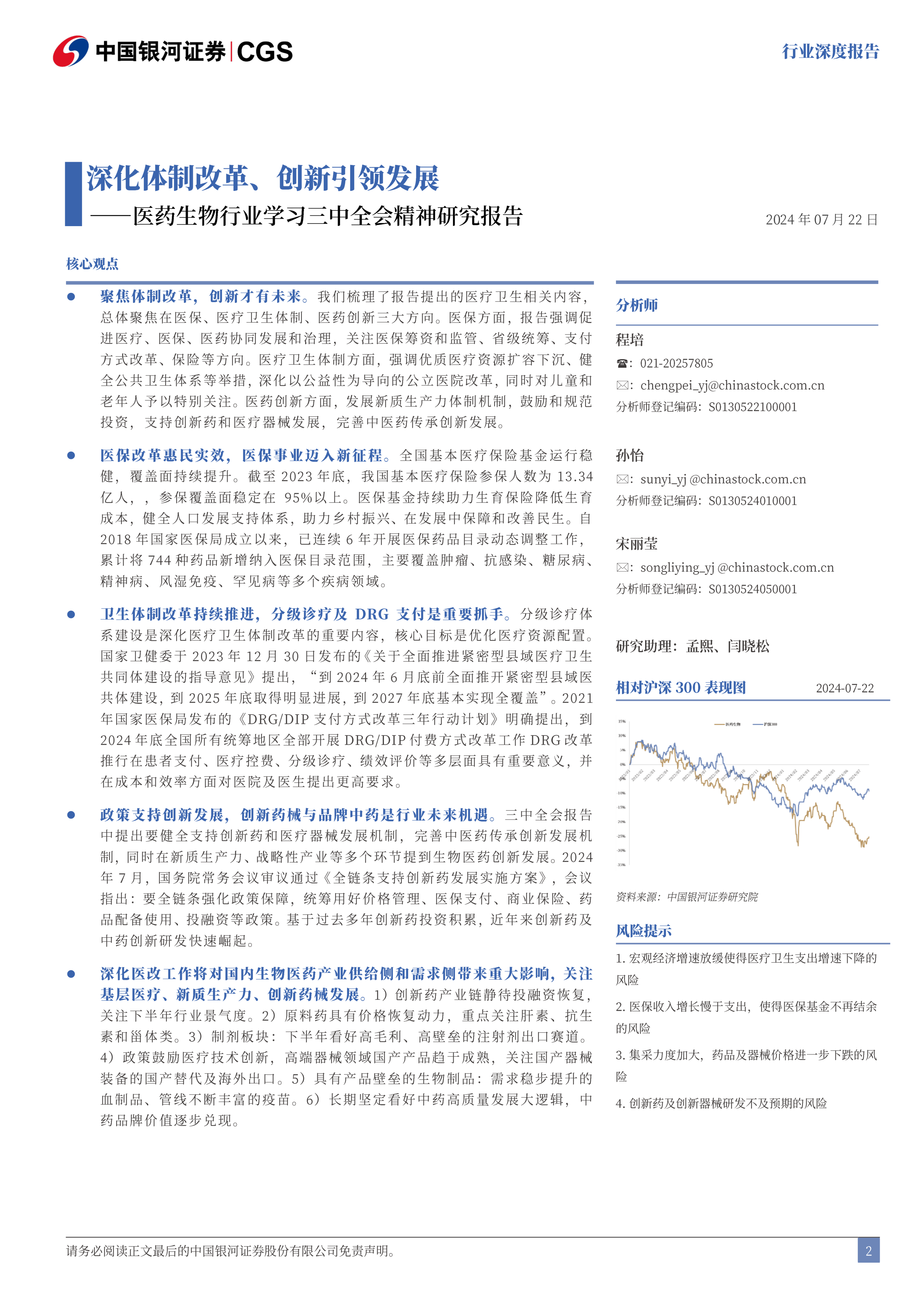 深化医改工作将对国内生物医药产业供给侧和需求侧带来重大影响,关注基层医疗、新质生产力、创新药械发展。1)创新药产业链静待投融资恢复,关注下半年行业景气度。2)原料药具有价格恢复动力,重点关注肝素、抗生素和甾体类。3)制剂板块:下半年看好高毛利、高壁垒的注射剂出口赛道。4)政策鼓励医疗技术创新,高端器械领域国产产品趋于成熟,关注国产器械装备的国产替代及海外出口。5)具有产品壁垒的生物制品:需求稳步提升的血制品、管线不断丰富的疫苗。6)长期坚定看好中药高质量发展大逻辑,中药品牌价值逐步兑现。