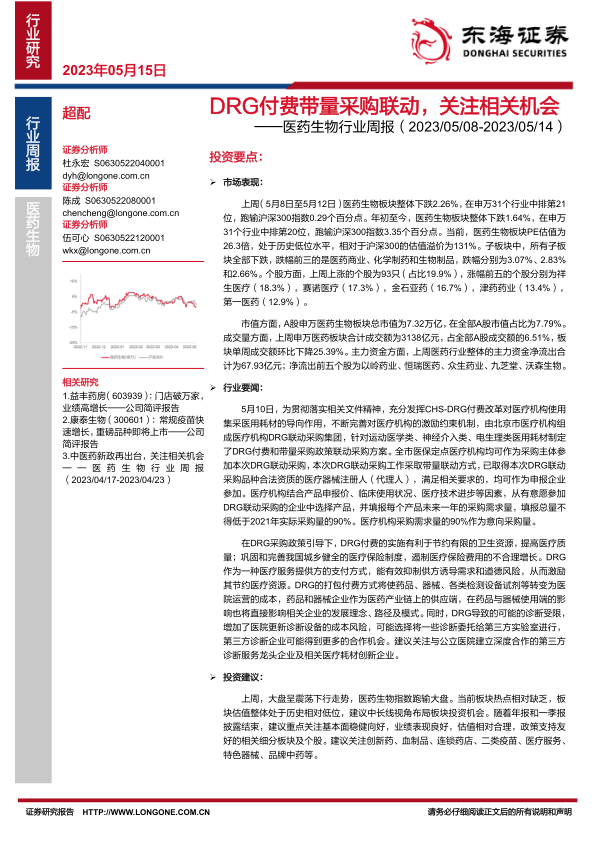 医药生物行业周报:DRG付费带量采购联动,关注相关机会