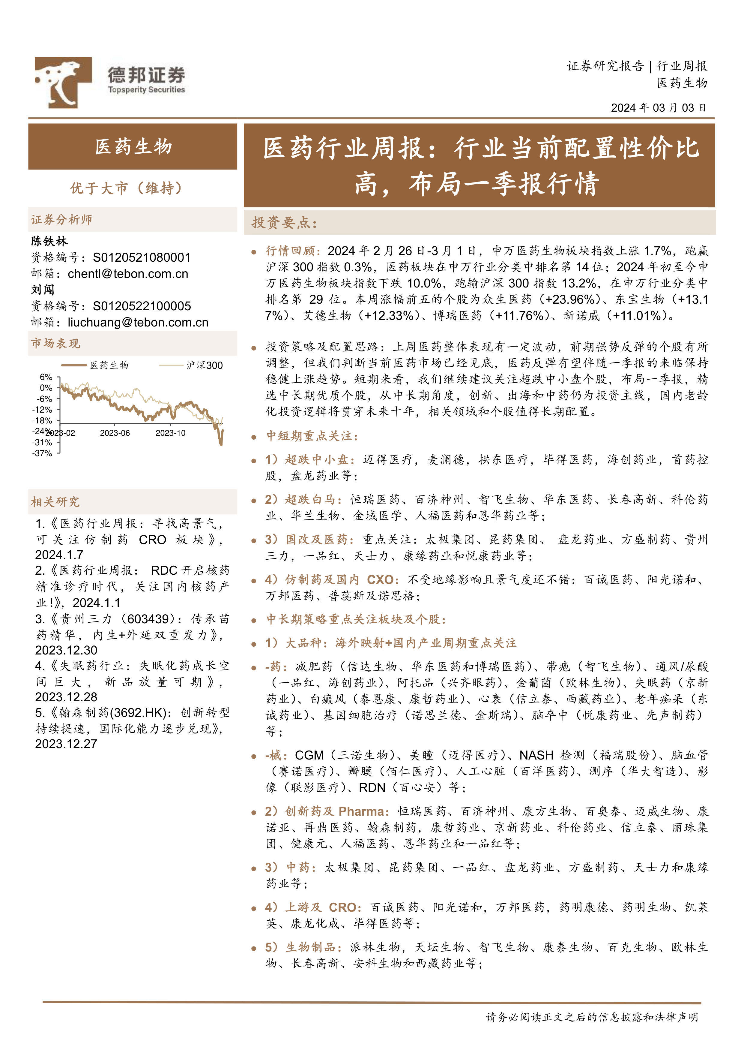 投资策略及配置思路:上周医药整体表现有一定波动,前期强势反弹的个股有所调整,但我们判断当前医药市场已经见底,医药反弹有望伴随一季报的来临保持稳健上涨趋势。短期来看,我们继续建议关注超跌中小盘个股,布局一季报,精选中长期优质个股,从中长期角度,创新、出海和中药仍为投资主线,国内老龄化投资逻辑将贯穿未来十年,相关领域和个股值得长期配置。