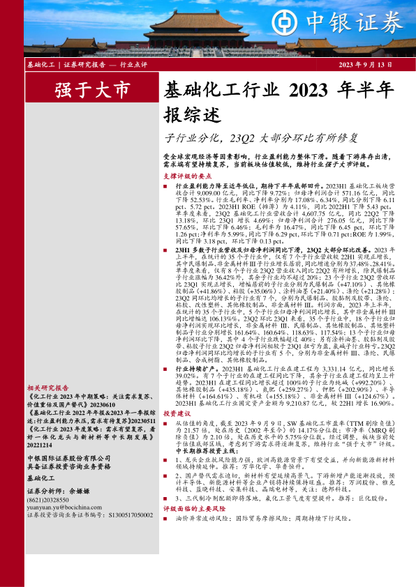 基础化工行业2023年半年报综述:子行业分化,23Q2大部分环比有所修复