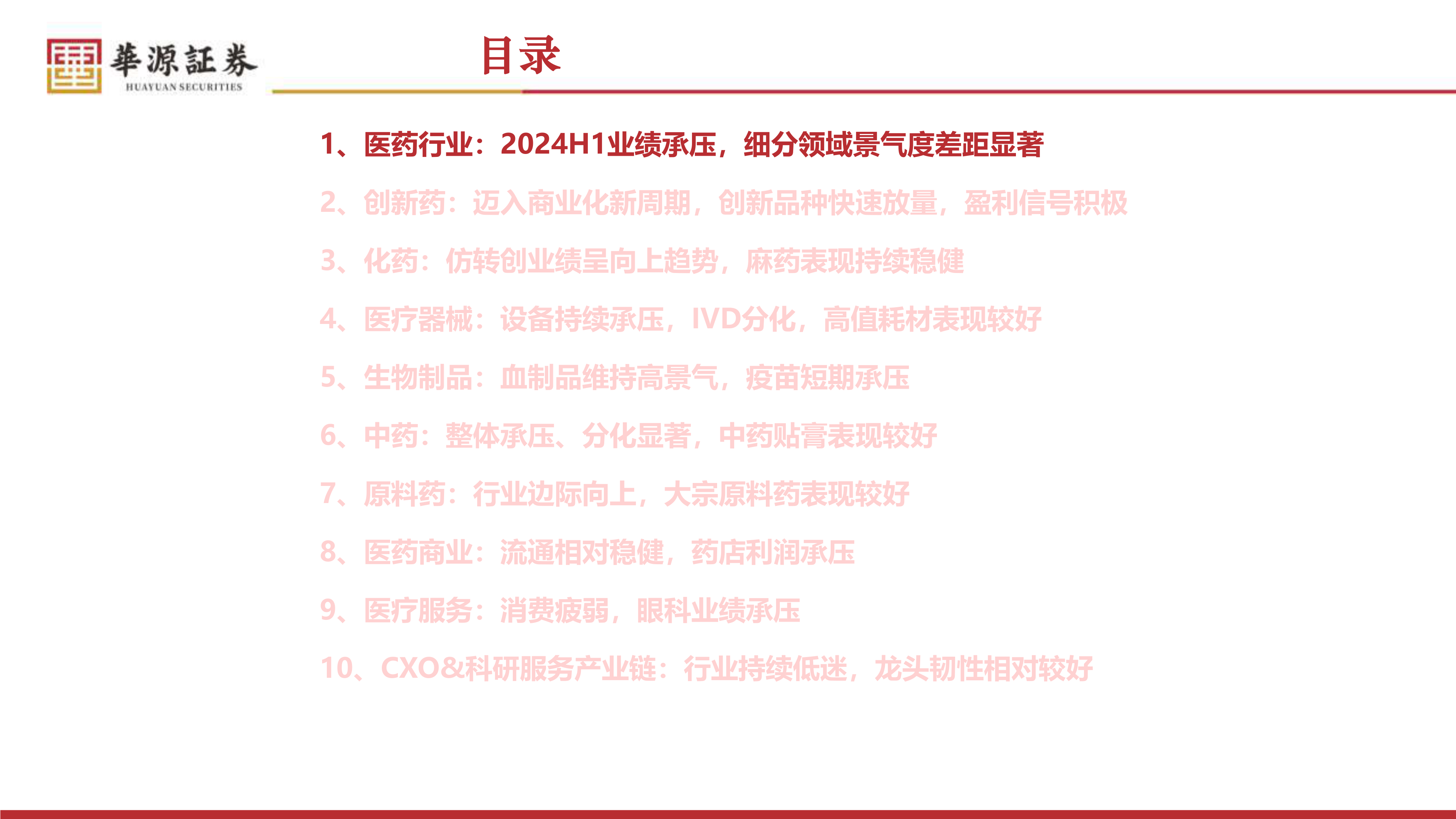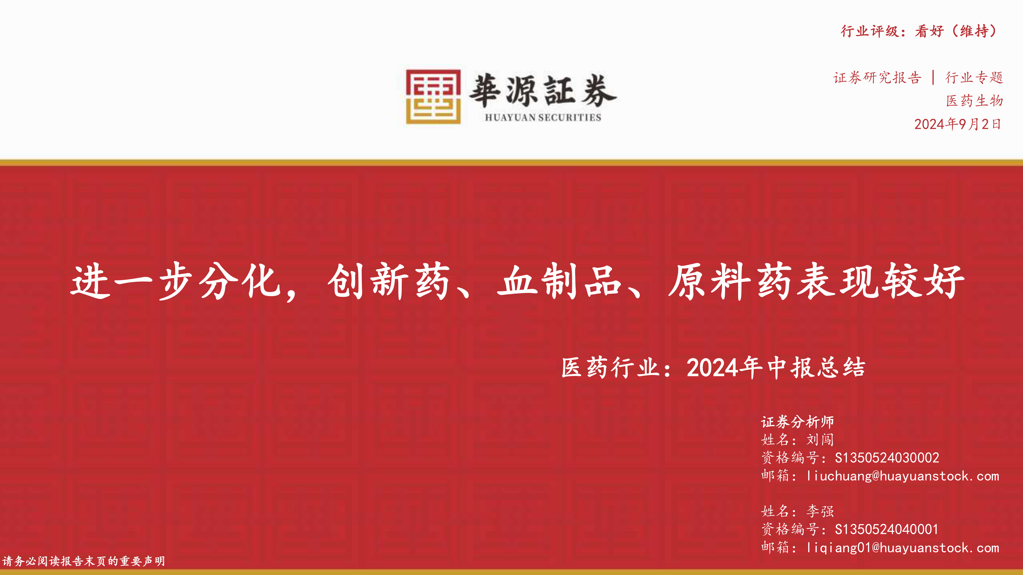 医药行业:2024年中报总结:进一步分化,创新药、血制品、原料药表现较好