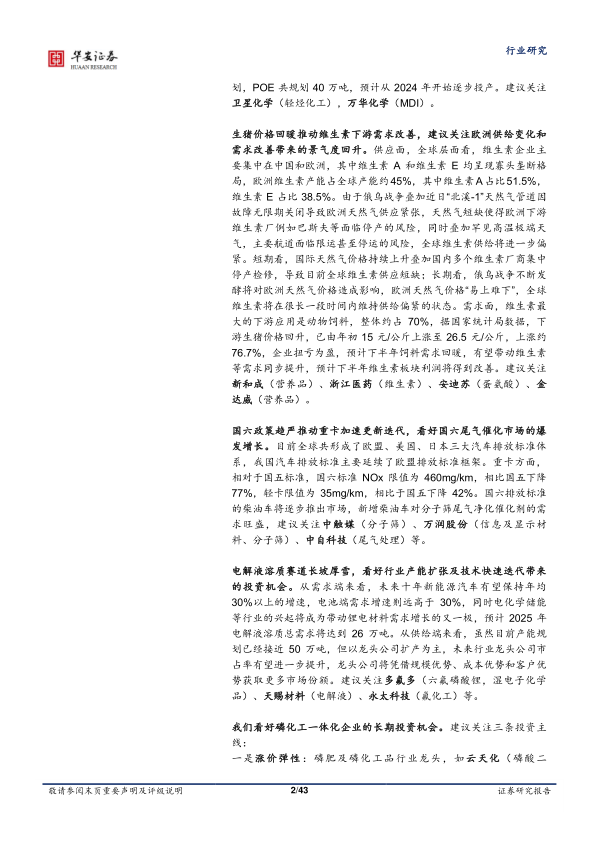 我们看好磷化工一体化企业的长期投资机会。 建议关注三条投资主线: