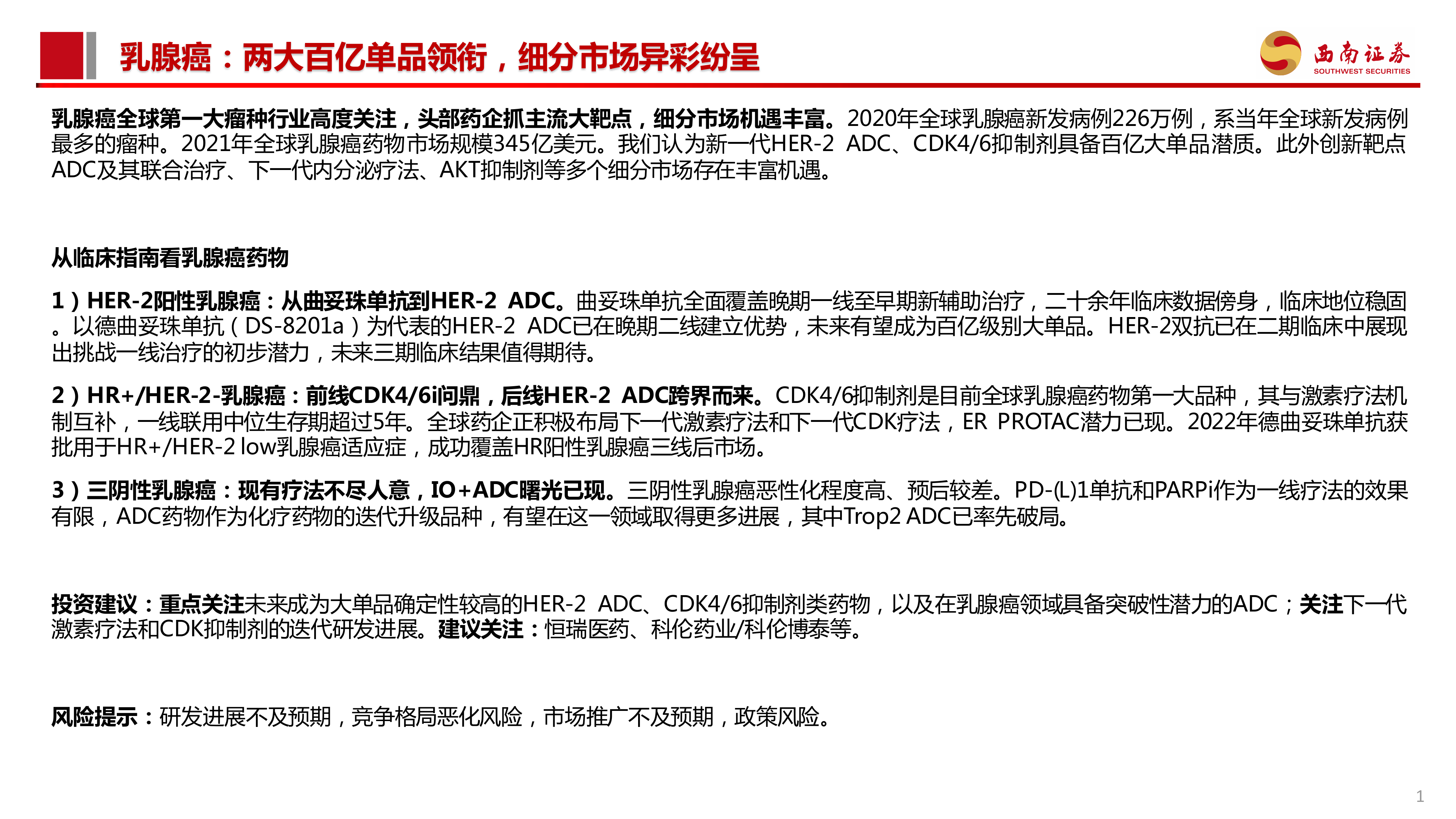 乳腺癌全球第一大瘤种行业高度关注,头部药企抓主流大靶点,细分市场机遇丰富。2020年全球乳腺癌新发病例226万例,系当年全球新发病例最多的瘤种。2021年全球乳腺癌药物市场规模345亿美元。我们认为新一代HER-2ADC、CDK4/6抑制剂具备百亿大单品潜质。此外创新靶点ADC及其联合治疗、下一代内分泌疗法、AKT抑制剂等多个细分市场存在丰富机遇。