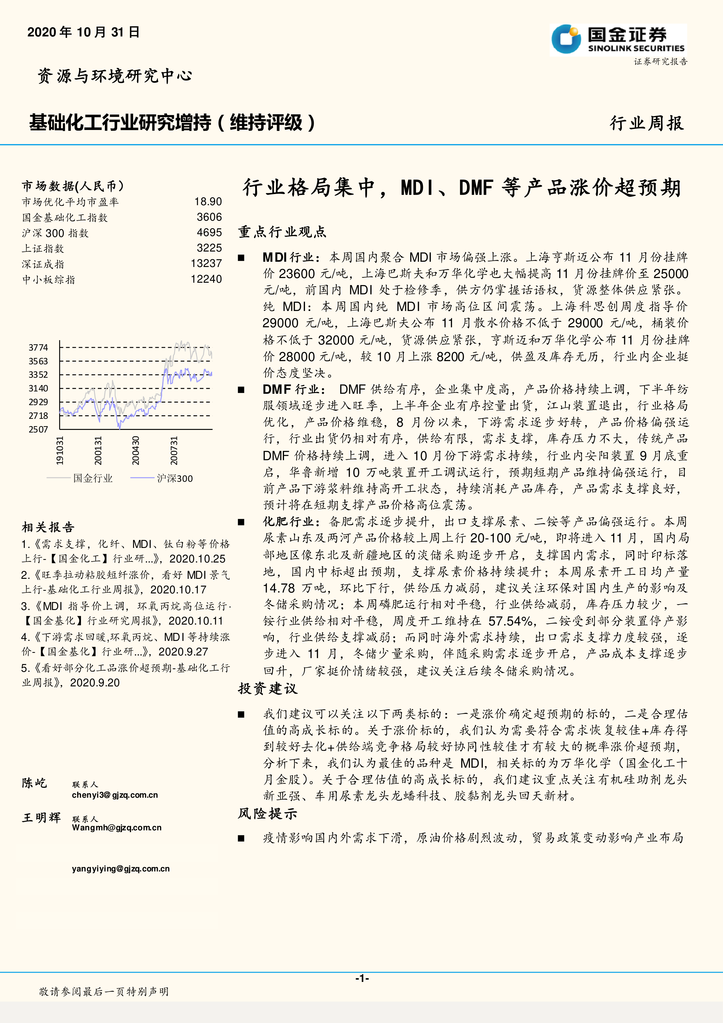 本报告深入分析了 2020 年 10 月底基础化工行业的市场表现,重点关注了 MDI、DMF 和化肥等行业。报告指出,市场格局集中、部分产品价格超预期上涨是当前行业的主要特征。报告还对多个子行业进行了分析,并给出了投资建议和风险提示。 投资者应密切关注疫情、原油价格和贸易政策等因素对行业的影响。
