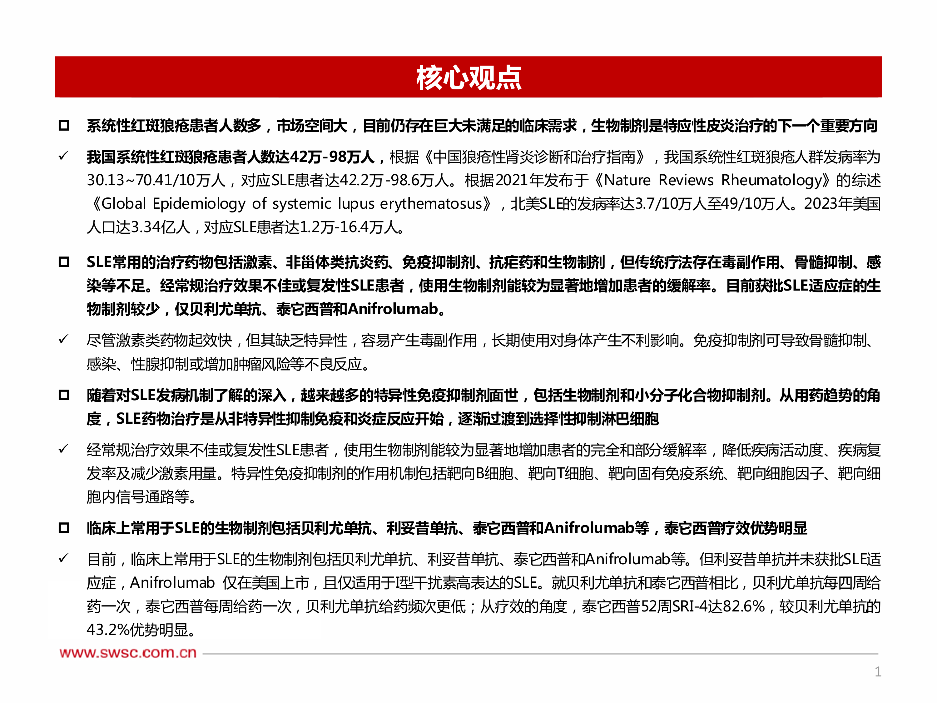 系统性红斑狼疮患者人数多,市场空间大,目前仍存在巨大未满足的临床需求,生物制剂是特应性皮炎治疗的下一个重要方向