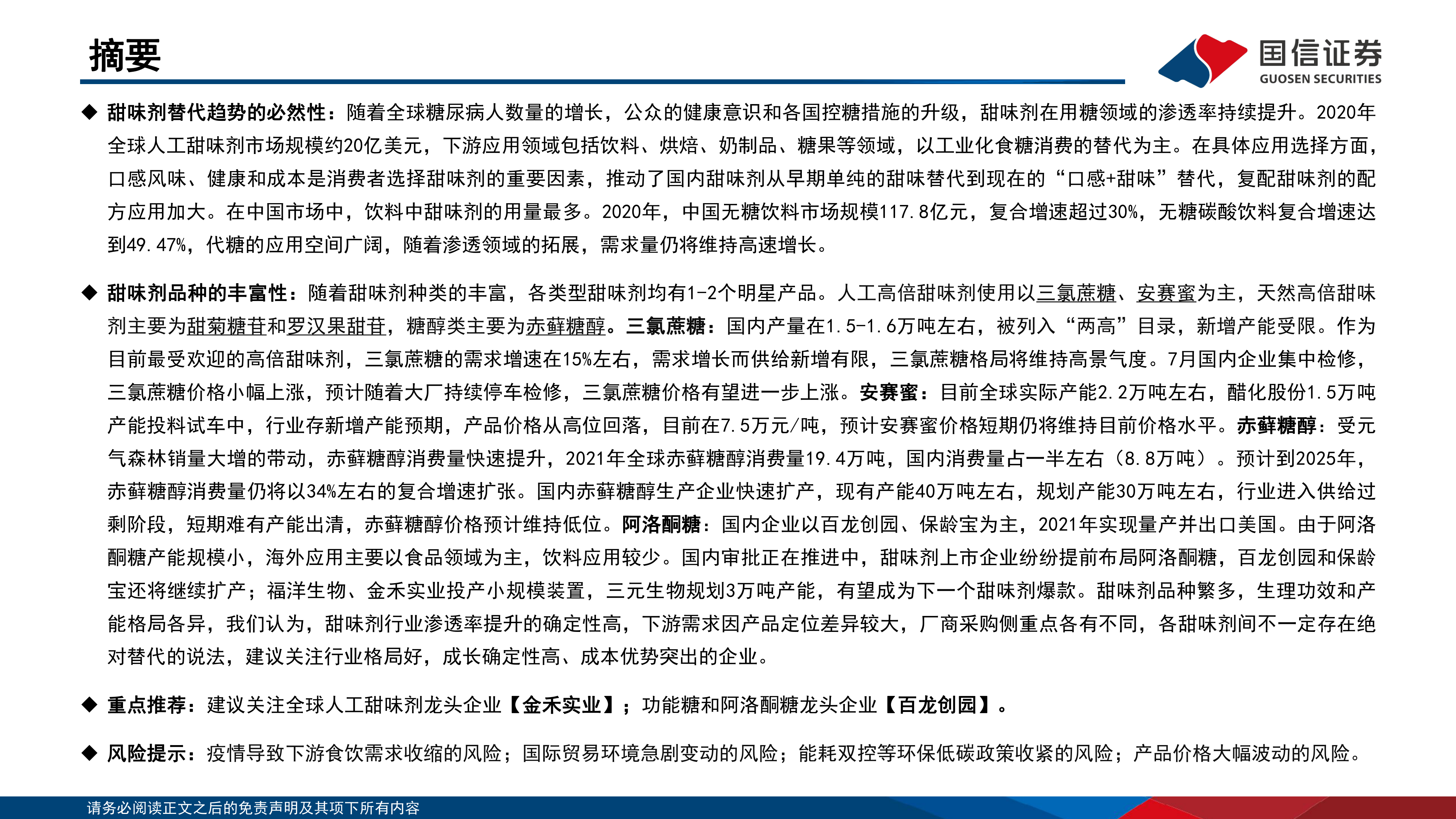 甜味剂品种的丰富性:随着甜味剂种类的丰富,各类型甜味剂均有1-2个明星产品。人工高倍甜味剂使用以三氯蔗糖、安赛蜜为主,天然高倍甜味剂主要为甜菊糖苷和罗汉果甜苷,糖醇类主要为赤藓糖醇。三氯蔗糖:国内产量在1.5-1.6万吨左右,被列入“两高”目录,新增产能受限。作为目前最受欢迎的高倍甜味剂,三氯蔗糖的需求增速在15%左右,需求增长而供给新增有限,三氯蔗糖格局将维持高景气度。7月国内企业集中检修,三氯蔗糖价格小幅上涨,预计随着大厂持续停车检修,三氯蔗糖价格有望进一步上涨。安赛蜜:目前全球实际产能2.2万吨左右,醋化股份1.5万吨产能投料试车中,行业存新增产能预期,产品价格从高位回落,目前在7.5万元/吨,预计安赛蜜价格短期仍将维持目前价格水平。赤藓糖醇:受元气森林销量大增的带动,赤藓糖醇消费量快速提升,2021年全球赤藓糖醇消费量19.4万吨,国内消费量占一半左右(8.8万吨)。预计到2025年,赤藓糖醇消费量仍将以34%左右的复合增速扩张。国内赤藓糖醇生产企业快速扩产,现有产能40万吨左右,规划产能30万吨左右,行业进入供给过剩阶段,短期难有产能出清,赤藓糖醇价格预计维持低位。阿洛酮糖:国内企业以百龙创园、保龄宝为主,2021年实现量产并出口美国。由于阿洛酮糖产能规模小,海外应用主要以食品领域为主,饮料应用较少。国内审批正在推进中,甜味剂上市企业纷纷提前布局阿洛酮糖,百龙创园和保龄宝还将继续扩产;福洋生物、金禾实业投产小规模装置,三元生物规划3万吨产能,有望成为下一个甜味剂爆款。甜味剂品种繁多,生理功效和产能格局各异,我们认为,甜味剂行业渗透率提升的确定性高,下游需求因产品定位差异较大,厂商采购侧重点各有不同,各甜味剂间不一定存在绝对替代的说法,建议关注行业格局好,成长确定性高、成本优势突出的企业。