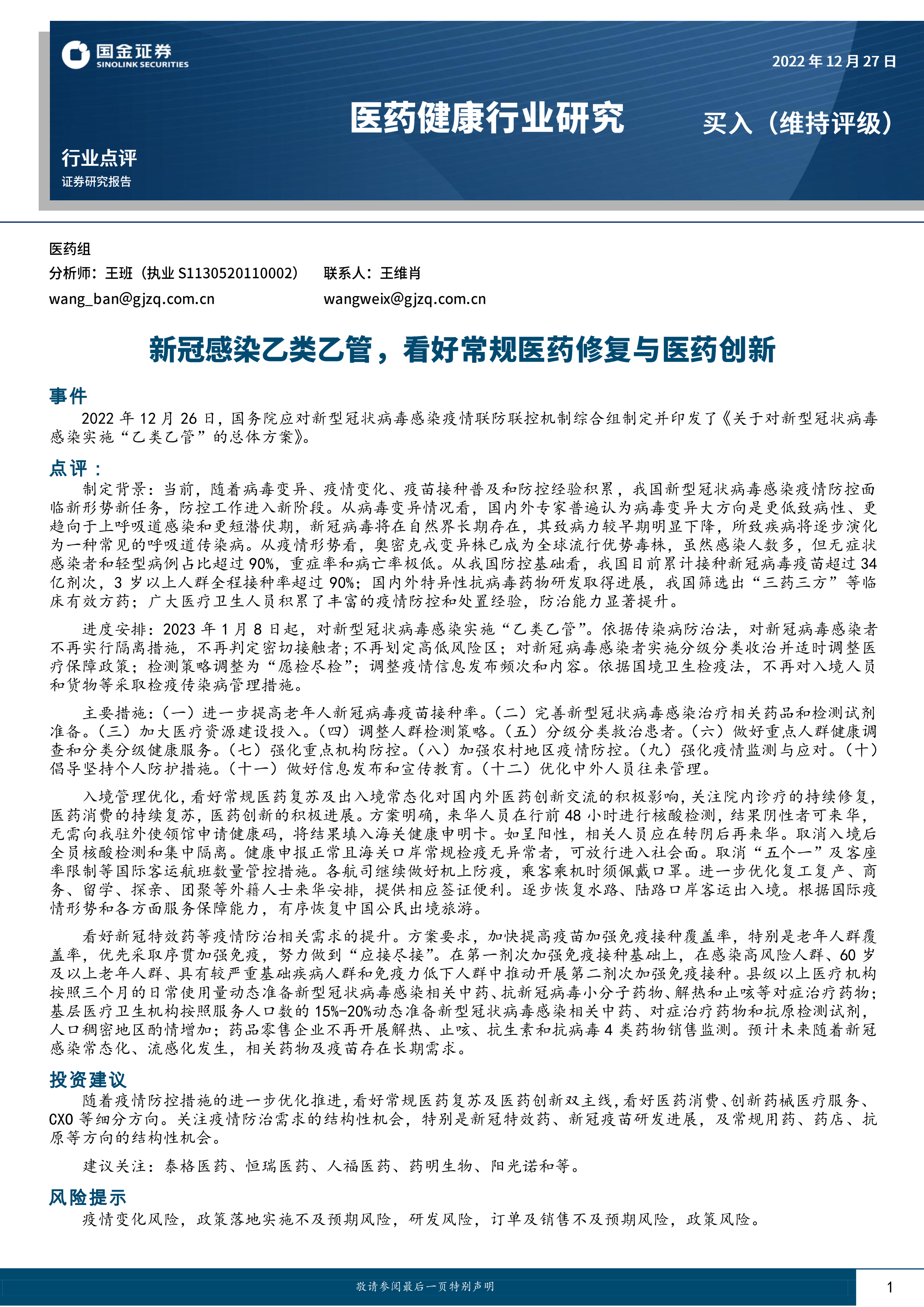 医药健康行业研究:新冠感染乙类乙管,看好常规医药修复与医药创新