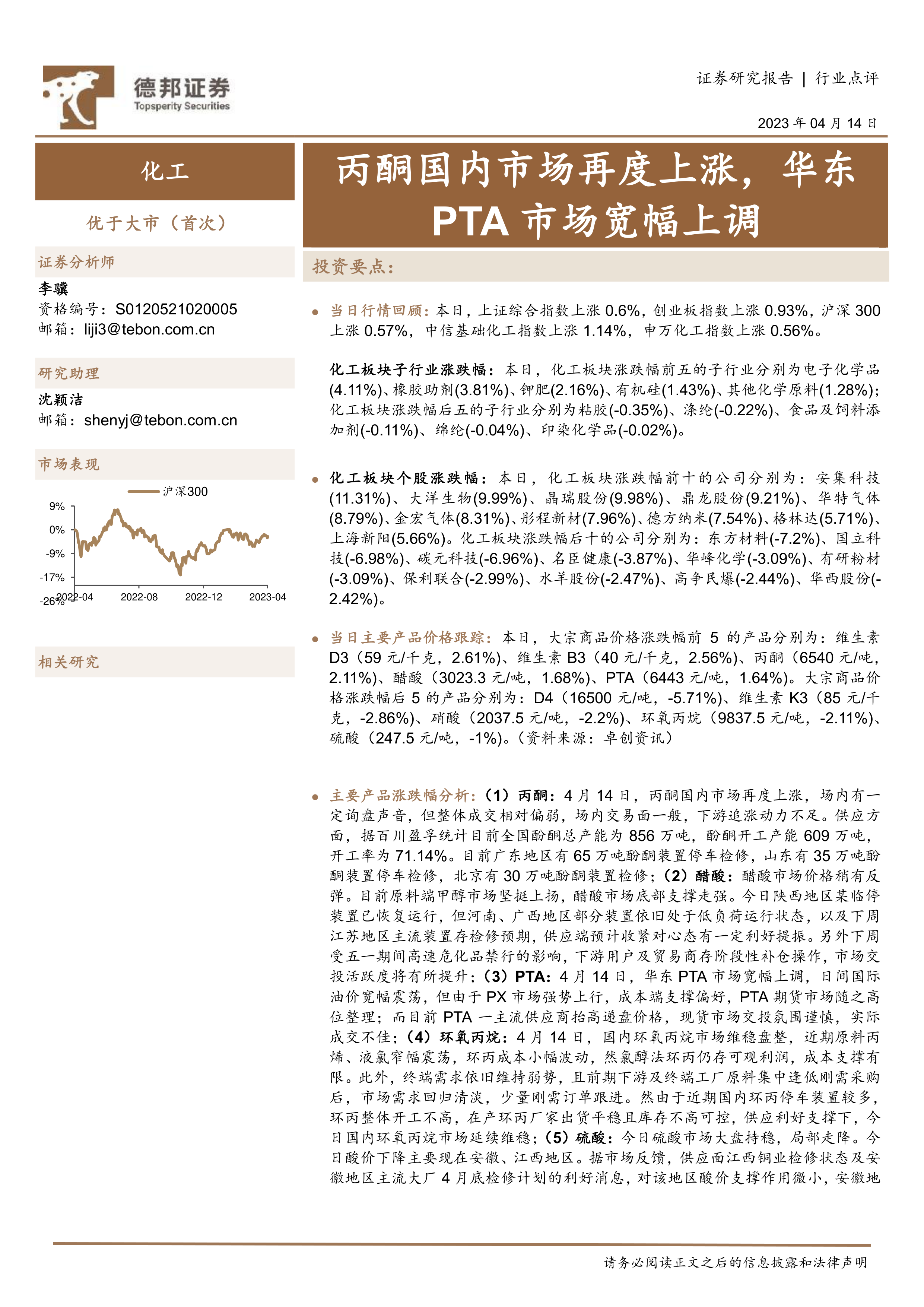 本报告分析了2023年4月14日化工行业的市场表现,指出大盘和化工板块整体上涨,但子行业和个股表现分化。报告重点分析了丙酮、醋酸、PTA、环氧丙烷和硫酸等主要化工产品的价格变动及影响因素,为投资者提供了市场动态的参考。