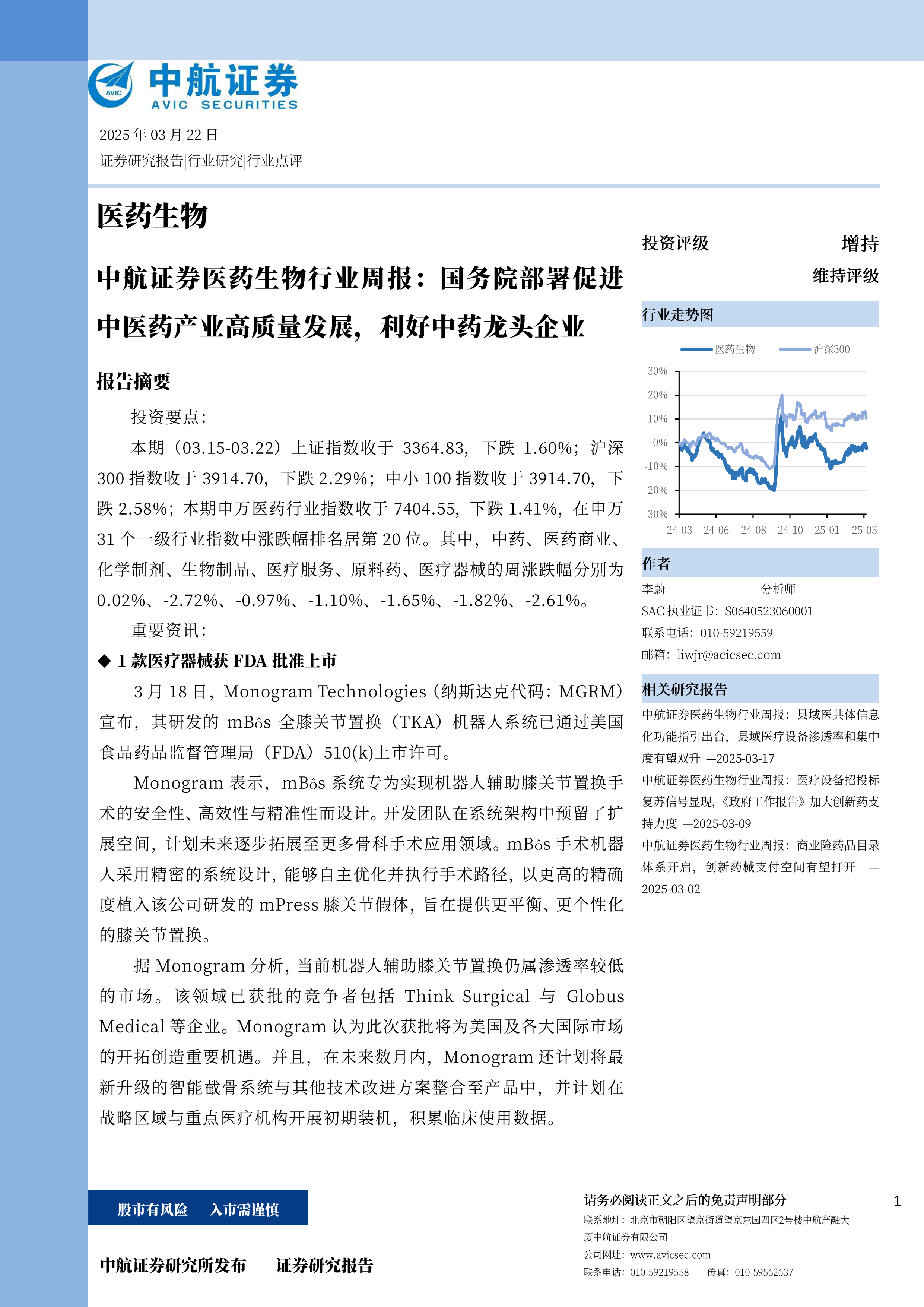 本期(03.15-03.22)上证指数收于3364.83,下跌1.60%;沪深300指数收于3914.70,下跌2.29%;中小100指数收于3914.70,下跌2.58%;本期申万医药行业指数收于7404.55,下跌1.41%,在申万31个一级行业指数中涨跌幅排名居第20位。其中,中药、医药商业、化学制剂、生物制品、医疗服务、原料药、医疗器械的周涨跌幅分别为0.02%、-2.72%、-0.97%、-1.10%、-1.65%、-1.82%、-2.61%。重要资讯: