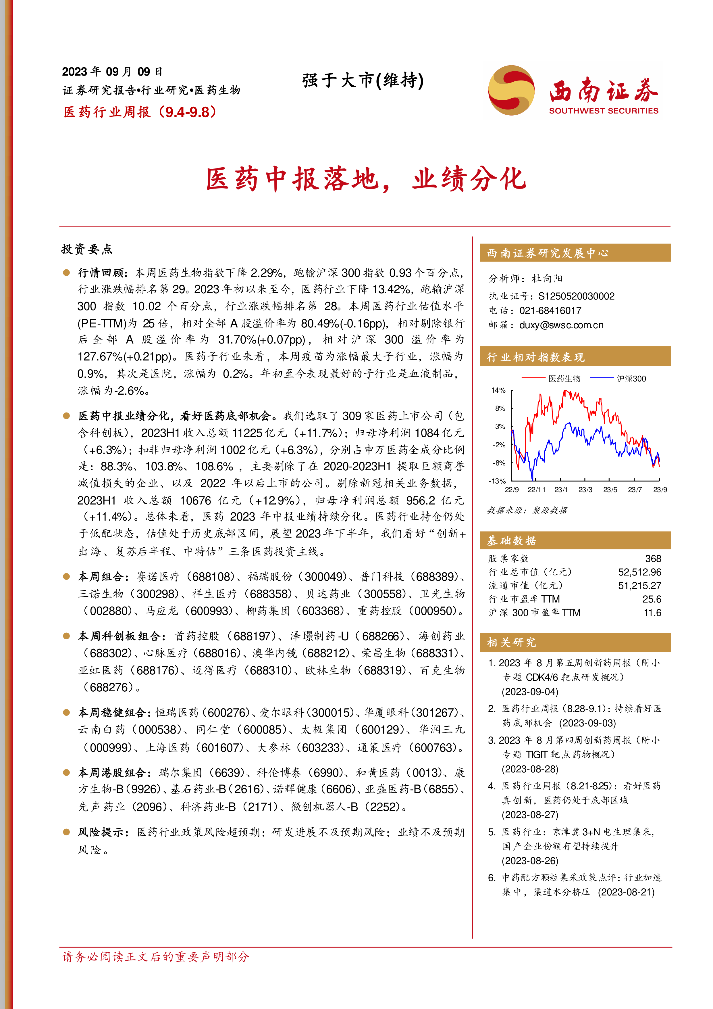 医药中报业绩分化,看好医药底部机会。 我们选取了 309家医药上市公司(包含科创板), 2023H1收入总额 11225亿元( +11.7%);归母净利润 1084亿元( +6.3%);扣非归母净利润 1002亿元( +6.3%),分别占申万医药全成分比例是: 88.3%、 103.8%、 108.6% ,主要剔除了在 2020-2023H1 提取巨额商誉减值损失的企业、以及 2022 年以后上市的公司。剔除新冠相关业务数据,2023H1 收入总额 10676 亿元( +12.9%),归母净利润总额 956.2 亿元( +11.4%)。总体来看,医药 2023 年中报业绩持续分化。医药行业持仓仍处于低配状态,估值处于历史底部区间,展望 2023年下半年,我们看好“创新+出海、复苏后半程、中特估”三条医药投资主线。