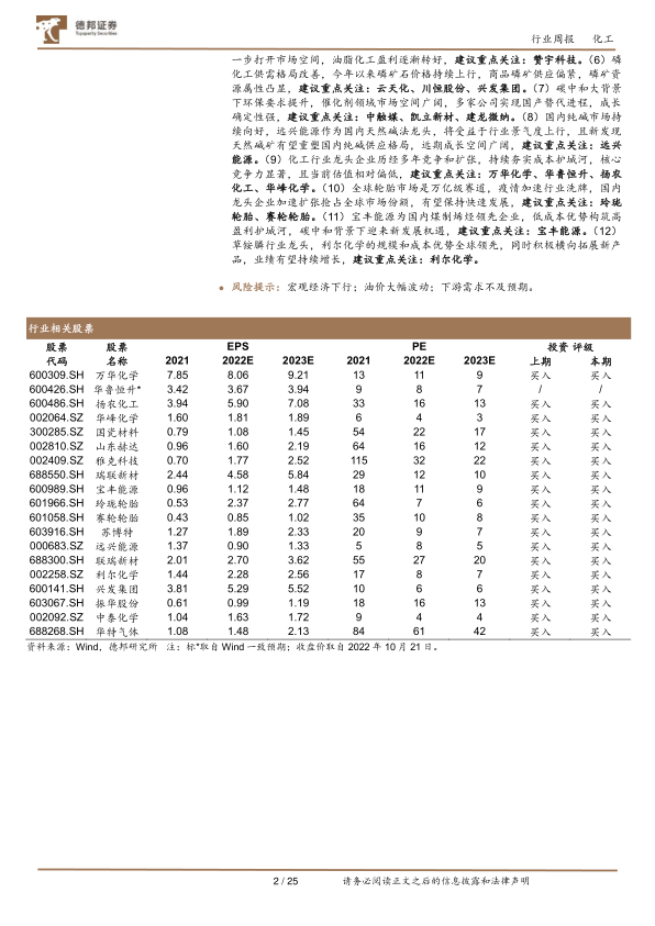 投资建议: (1)受下游光伏装机量提升预期带动,看好国内光伏级 EVA 未来景气度,建议重点关注:联泓新科。 (2)近期我国地沟油价格有所回落,生物柴油企业盈利能力增强,海外生物柴油需求量持续增长,看好生物柴油行业景气度。建议重点关注:嘉澳环保。 (3)硅基材料受新能源相关领域拉动,需求持续向好。受装配式建筑及光伏组件拉动,看好工业胶及建筑胶需求提升,建议重点关注:硅宝科技。看好未来多晶硅产能持续投放下三氯氢硅的行业高景气度,建议重点关注:三孚股份。硅基材料需求向好,龙头企业凭借低成本优势实现产能扩张与产业链衍生,建议重点关注:合盛硅业。 (4)碳中和大背景下,看好能降低生产成本、碳排放的合成生物学企业,建议重点关注:凯赛生物、华恒生物。 (5)市场关注点向高成长性细分赛道龙头切换,细分赛道龙头标的:聚乙烯醇行业格局高度集中,产品价格处历史级景气周期,电石价格下滑导致产品价差扩大,全年业绩或超预期,建议重点关注:皖维高新。铬化学品行业整合完成,行业格局优化下头部企业控价能力出色,铬化学品价格经历多轮上调,提振公司业绩,建议重点关注:振华股份。表面活性剂市场空间广阔,相关公司向下游 OEM 进军进 f一步打开市场空间,油脂化工盈利逐渐转好,建议重点关注:赞宇科技。 (6)磷化工供需格局改善,今年以来磷矿石价格持续上行,商品磷矿供应偏紧,磷矿资源属性凸显,建议重点关注:云天化、川恒股份、兴发集团。 (7)碳中和大背景下环保要求提升,催化剂领域市场空间广阔,多家公司实现国产替代进程,成长确定性强,建议重点关注:中触媒、凯立新材、建龙微纳。 (8)国内纯碱市场持续向好,远兴能源作为国内天然碱法龙头,将受益于行业景气度上行,且新发现天然碱矿有望重塑国内纯碱供应格局,远期成长空间广阔,建议重点关注:远兴能源。 (9)化工行业龙头企业历经多年竞争和扩张,持续夯实成本护城河,核心竞争力显著,且当前估值相对偏低,建议重点关注:万华化学、华鲁恒升、扬农化工、华峰化学。 (10)全球轮胎市场是万亿级赛道,疫情加速行业洗牌,国内龙头企业加速扩张抢占全球市场份额,有望保持快速发展,建议重点关注:玲珑轮胎、赛轮轮胎。 (1 1)宝丰能源为国内煤制烯烃领先企业,低成本优势构筑高盈利护城河,碳中和背景下迎来新发展机遇,建议重点关注:宝丰能源。 (12)草铵膦行业龙头,利尔化学的规模和成本优势全球领先,同时积极横向拓展新产品,业绩有望持续增长,建议重点关注:利尔化学。