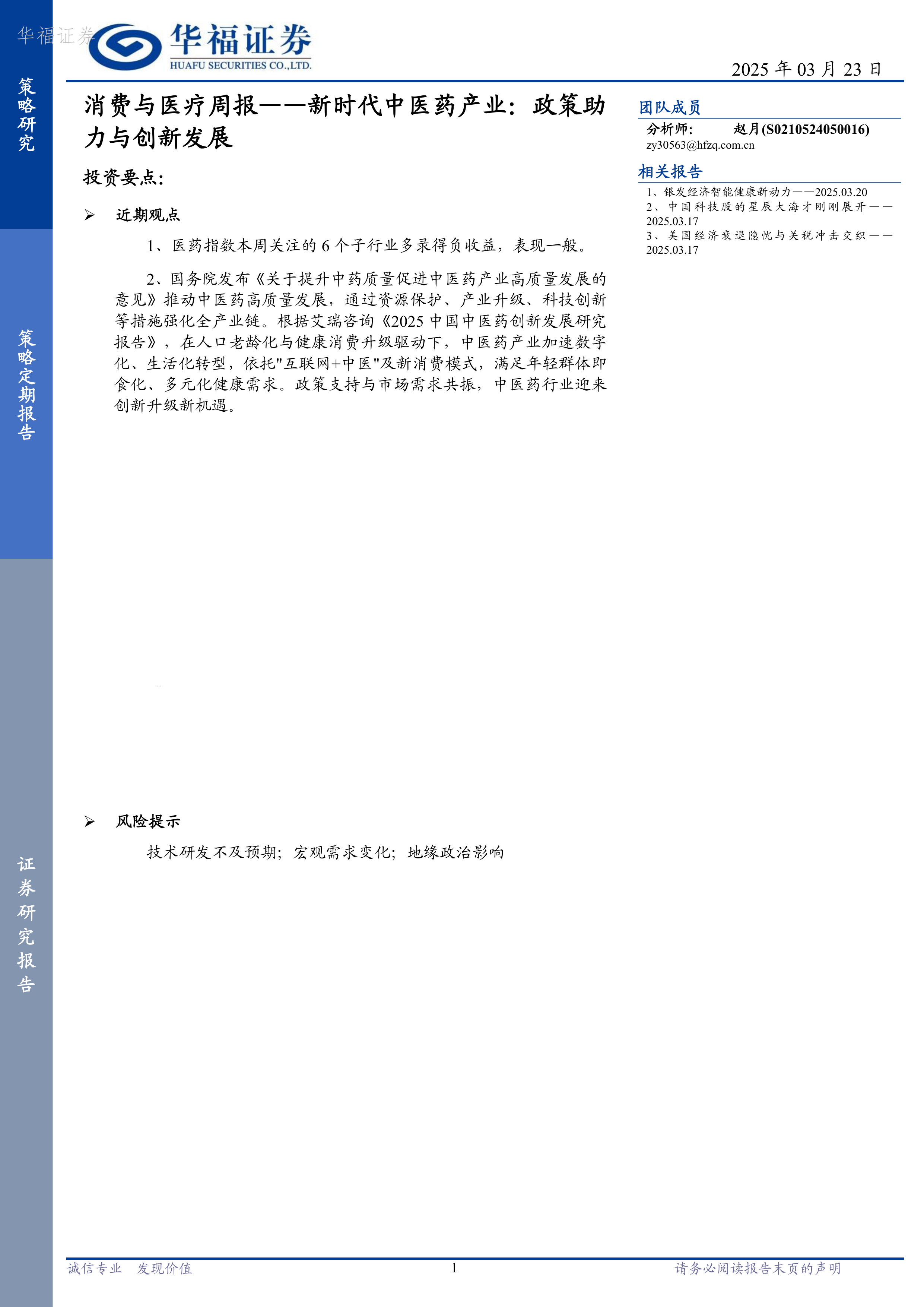 1、医药指数本周关注的6个子行业多录得负收益,表现一般。2、国务院发布《关于提升中药质量促进中医药产业高质量发展的意见》推动中医药高质量发展,通过资源保护、产业升级、科技创新等措施强化全产业链。根据艾瑞咨询《2025中国中医药创新发展研究报告》,在人口老龄化与健康消费升级驱动下,中医药产业加速数字化、生活化转型,依托"互联网+中医"及新消费模式,满足年轻群体即食化、多元化健康需求。政策支持与市场需求共振,中医药行业迎来创新升级新机遇。