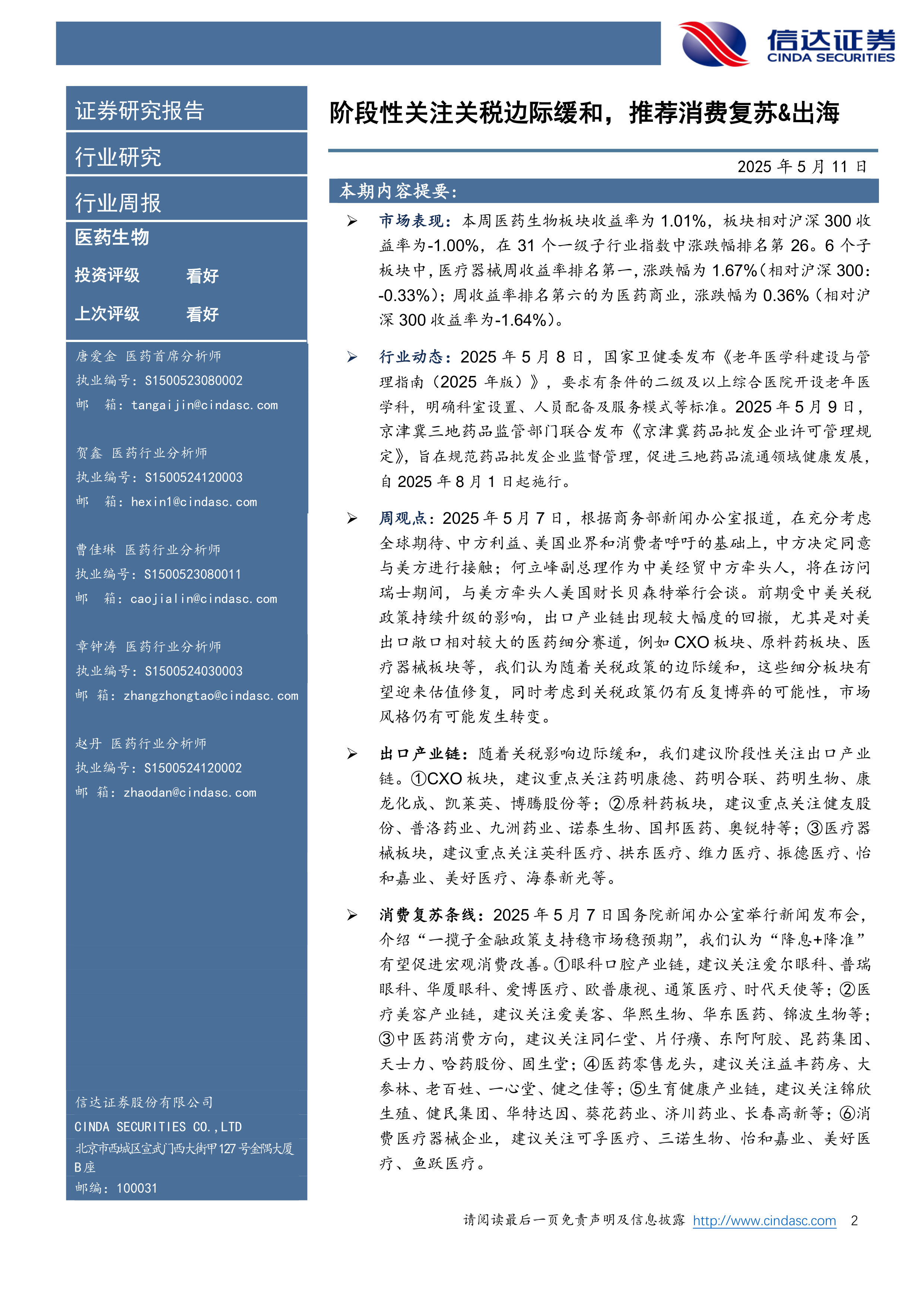 本周报重点关注了中美关税政策的边际缓和对医药行业的影响,建议投资者关注出口产业链和消费复苏相关板块。报告分析了医药行业的市场表现、估值水平,并提供了详细的行业和公司动态信息,以及重点个股的涨跌幅和估值数据,为投资者提供了全面的参考。