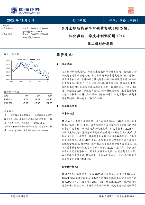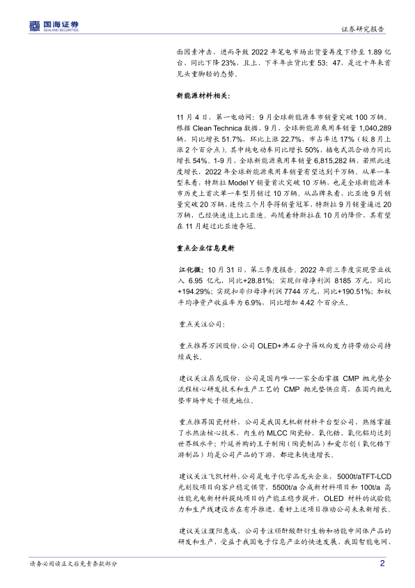 化工新材料周报:9月全球新能源车市销量突破100万辆,江化微前三季度净利润同增194%