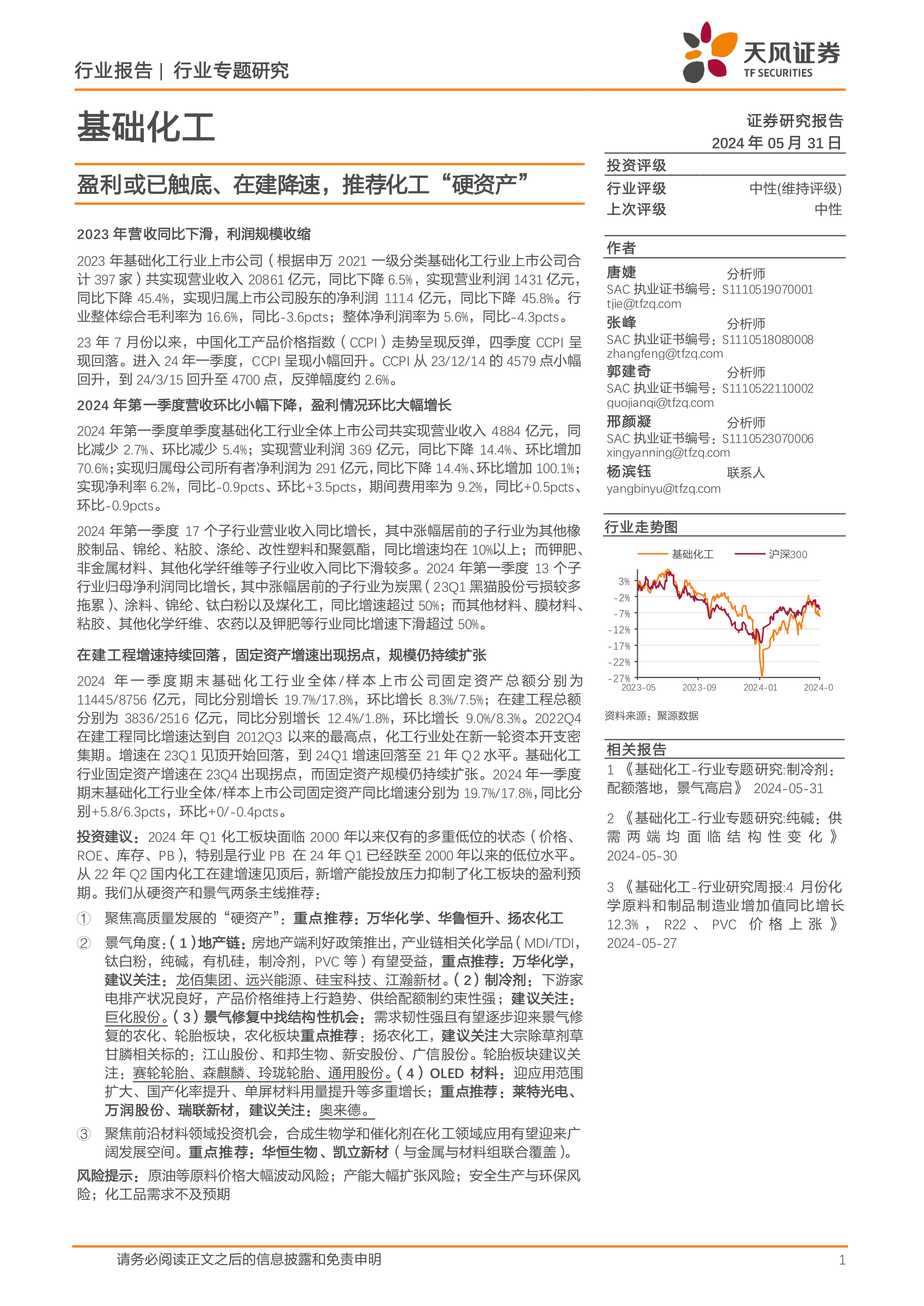 投资建议:2024年Q1化工板块面临2000年以来仅有的多重低位的状态(价格、ROE、库存、PB),特别是行业PB在24年Q1已经跌至2000年以来的低位水平。从22年Q2国内化工在建增速见顶后,新增产能投放压力抑制了化工板块的盈利预期。我们从硬资产和景气两条主线推荐: