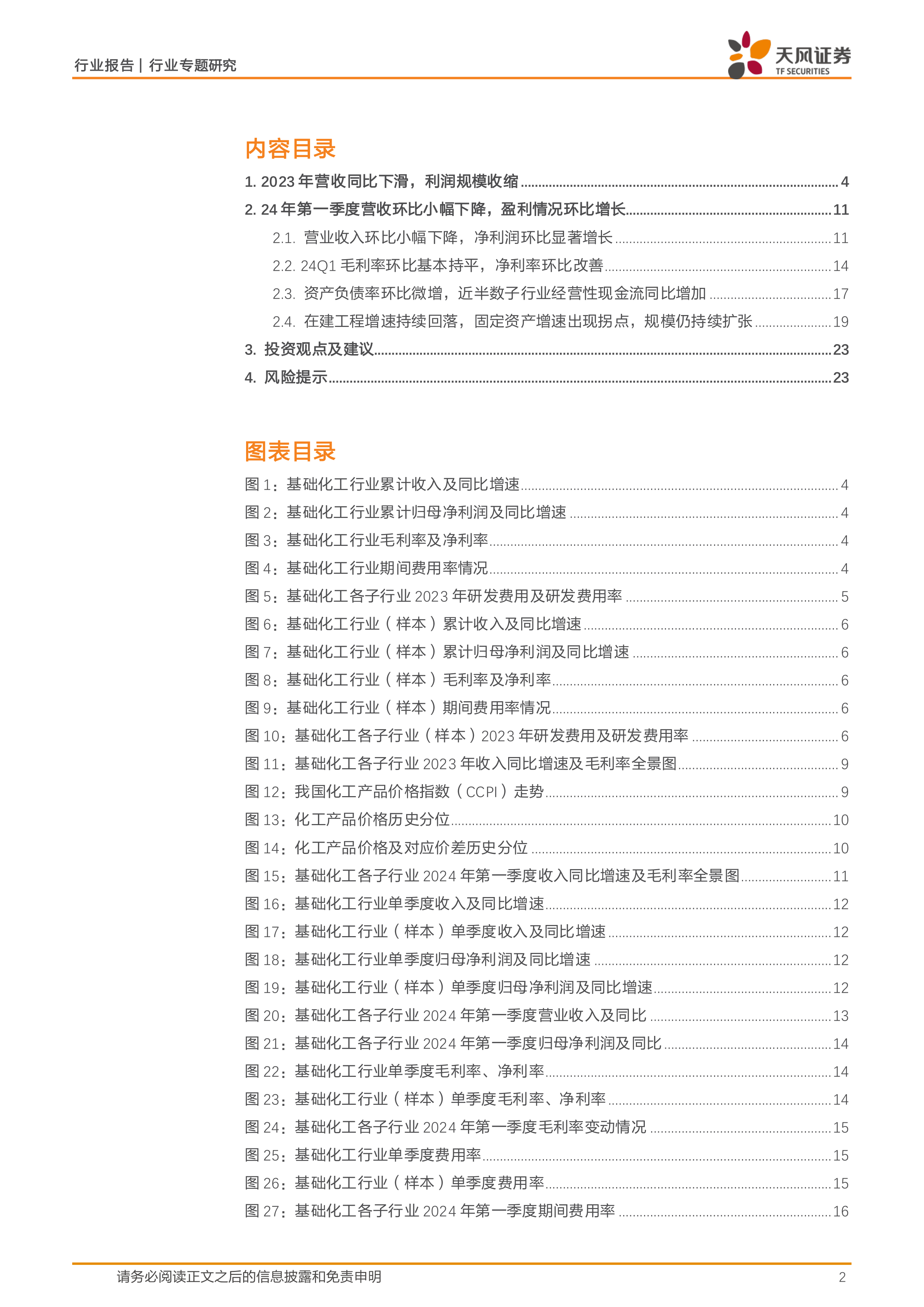 本报告深入分析了2023年及2024年一季度基础化工行业的财务数据,指出行业面临营收利润双降的挑战,但2024年一季度盈利能力有所回升。报告认为,行业估值处于历史低位,投资机会显现,并建议关注“硬资产”和景气周期两条主线,把握结构性投资机会。同时,报告也提示了原油价格波动、产能扩张、安全生产与环保以及化工品需求等风险因素。