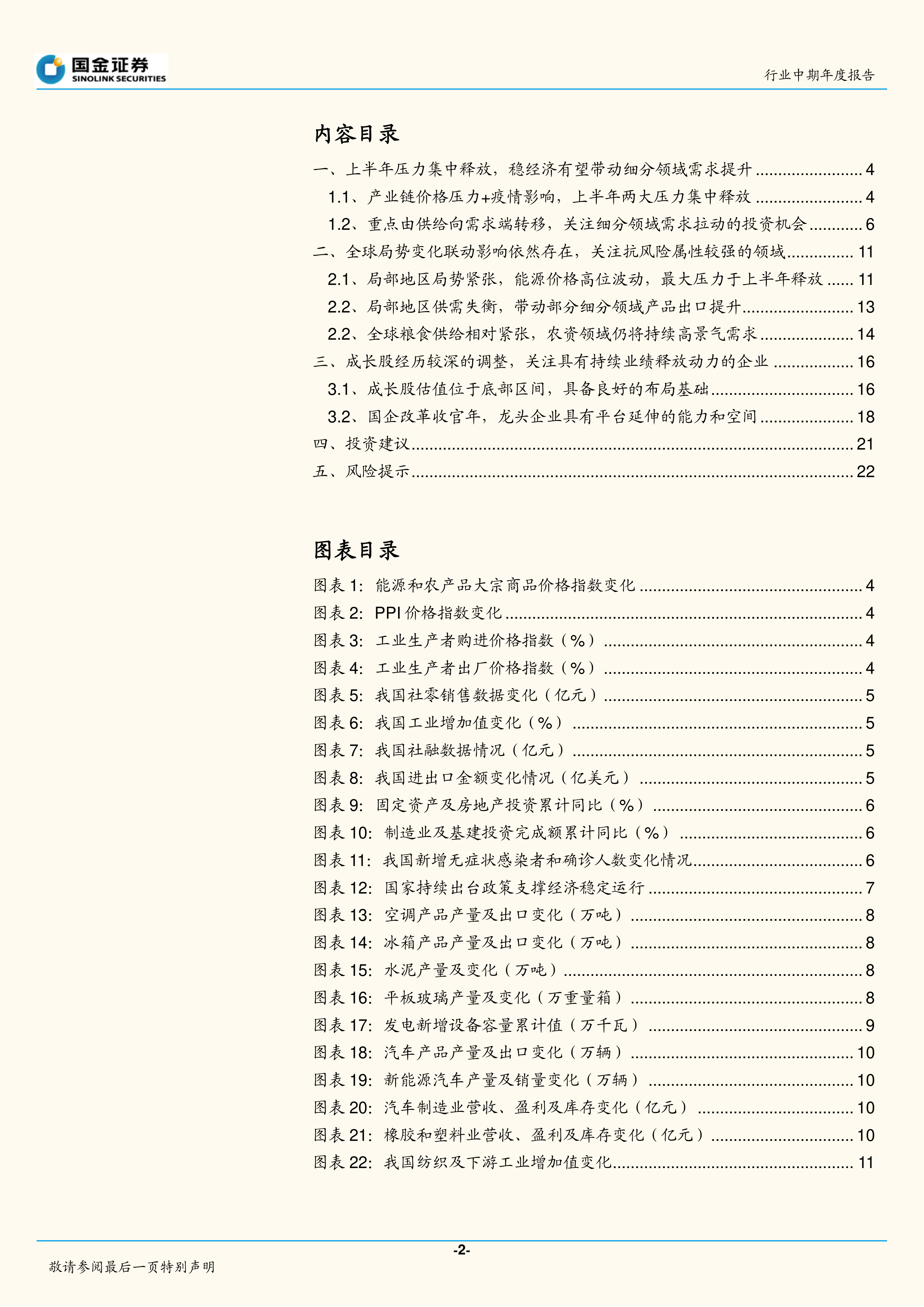 本报告分析了 2022 年上半年化工行业面临的挑战,包括能源价格上涨、疫情冲击和需求疲软。报告认为,随着稳经济政策的实施和疫情的缓解,下半年行业有望逐步改善。报告建议关注受益于经济复苏的细分领域,如地产链、新能源基建链和消费复苏链条,以及具有抗风险属性或顺应产业发展趋势的细分领域。同时,报告强调了成长股估值处于低位,并建议关注具有持续业绩释放动力的企业,特别是国企改革背景下的龙头企业。
