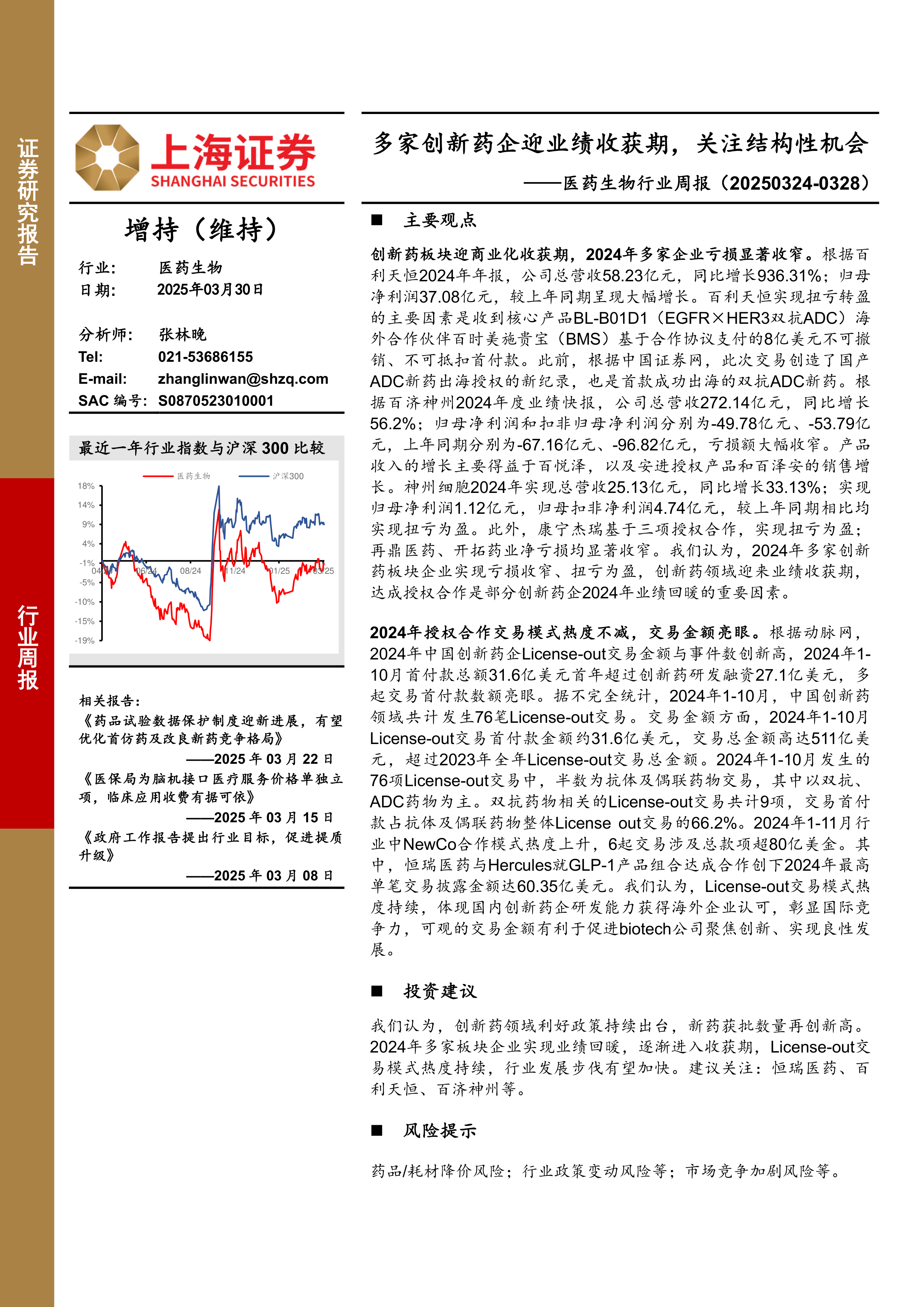 本报告重点分析了2024年创新药行业的业绩表现和License-out交易情况。报告指出,创新药企正迎来业绩收获期,授权合作是推动业绩增长的重要因素。同时,License-out交易持续火热,反映了国内创新药企的研发实力。报告建议关注相关创新药企,并提示了行业风险。