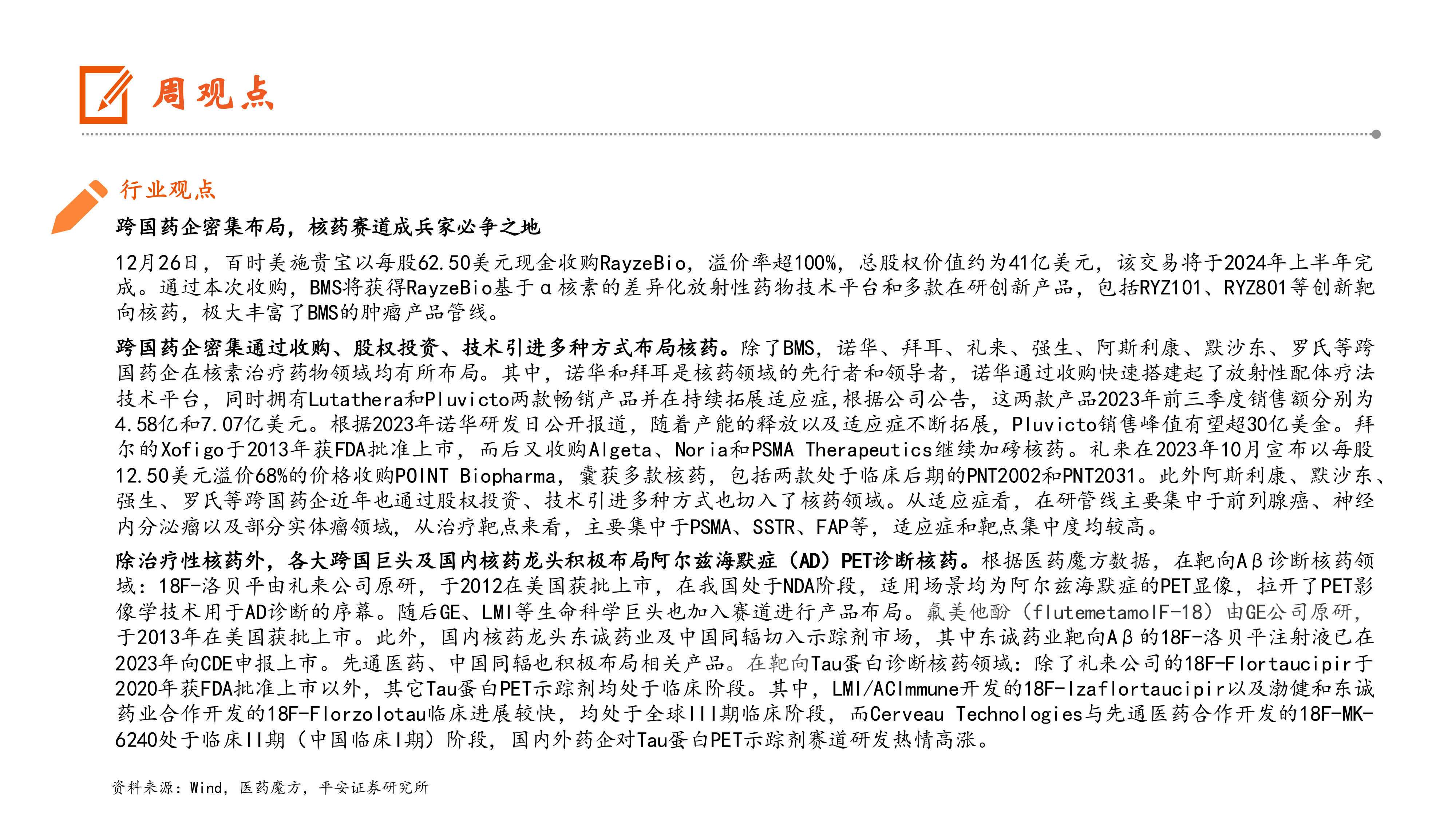 本报告重点分析了生物医药领域,特别是核药赛道的最新发展动态。 报告指出,跨国药企正在积极布局核药领域,通过收购、投资等方式扩大其在肿瘤治疗和阿尔兹海默症诊断领域的业务。 同时,报告也关注了国内企业在核药领域的积极布局。 报告还分析了上周医药板块的市场表现,并提供了重点关注公司的信息。 报告最后强调了投资策略,建议关注创新、海外市场和景气度边际转暖的细分赛道。