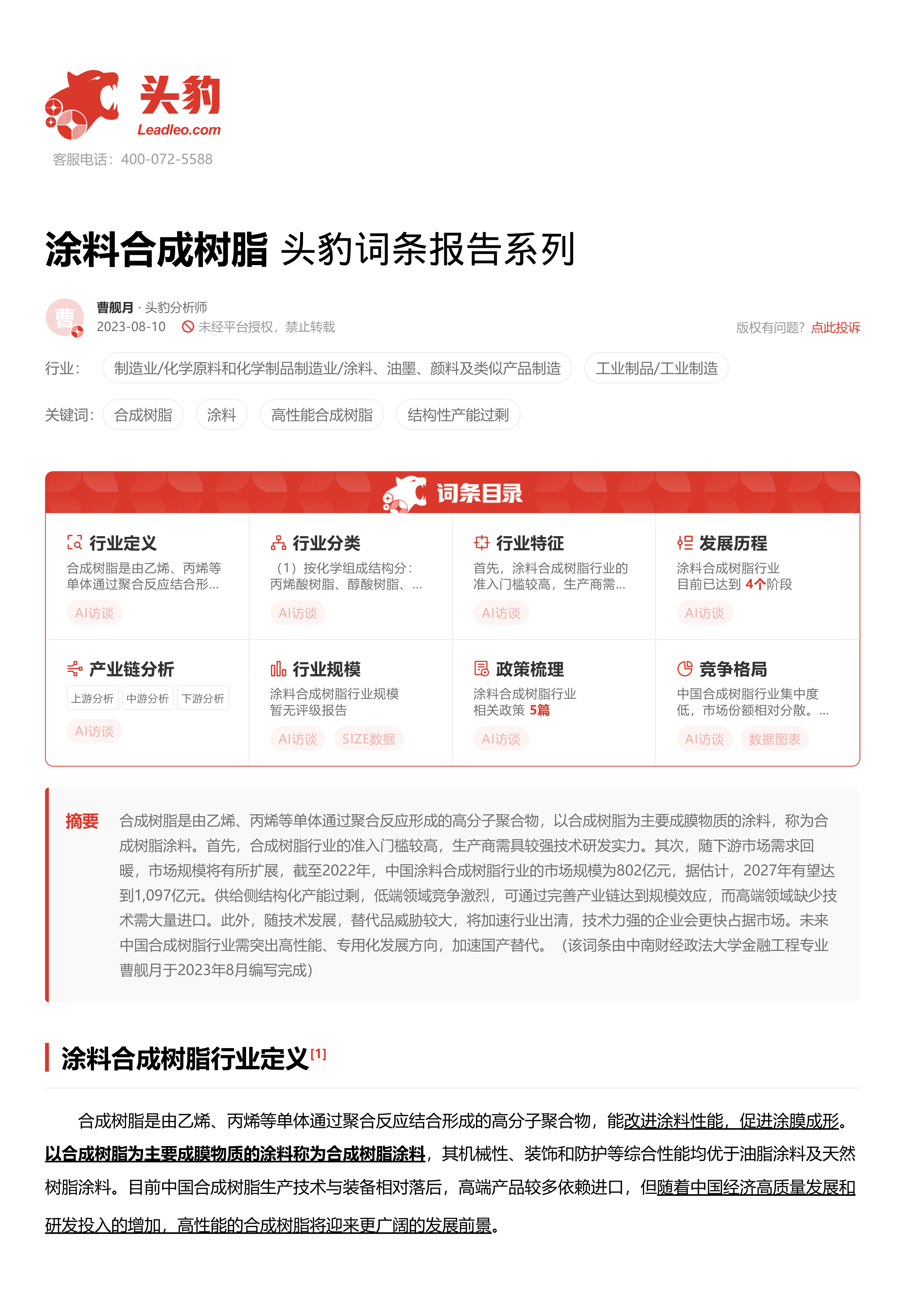 涂料合成树脂 头豹词条报告系列