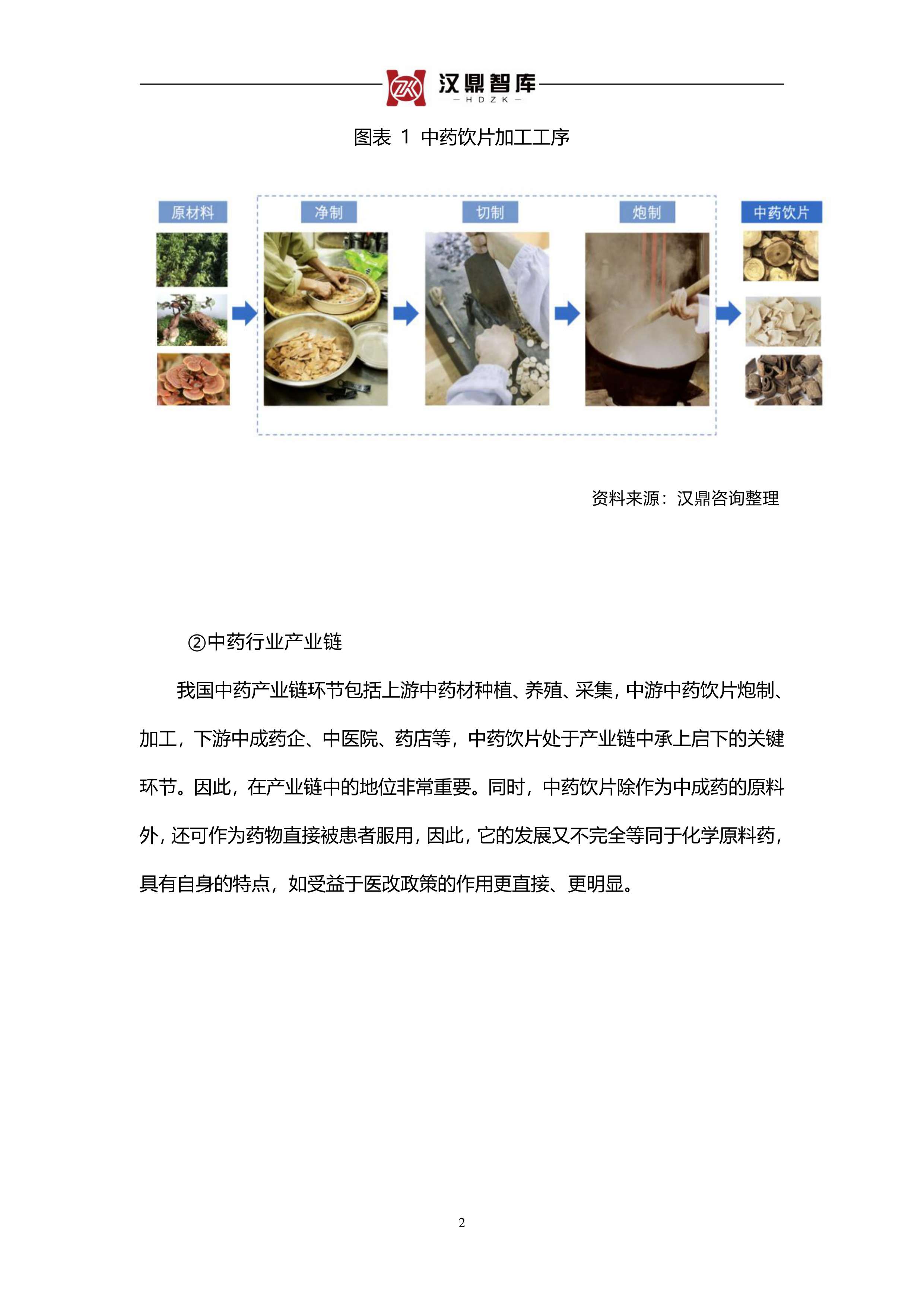 中药饮片行业处于中药产业链中承上启下的关键环节,上游为中药材种植、养殖、采集,下游为中成药企、中医院、药店等。由于其独特的属性,中药饮片行业的发展受益于医改政策,具有自身特点。