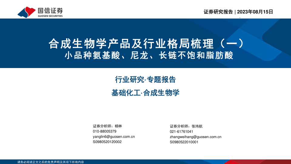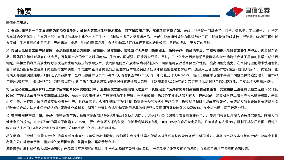 本报告分析了合成生物学在小品种氨基酸、生物基尼龙、长链不饱和脂肪酸等领域的应用前景,并对相关行业格局进行了梳理。合成生物学具有广阔的市场前景和发展潜力,华恒生物、凯赛生物、嘉必优等企业在相关领域具备技术和成本优势,值得关注。