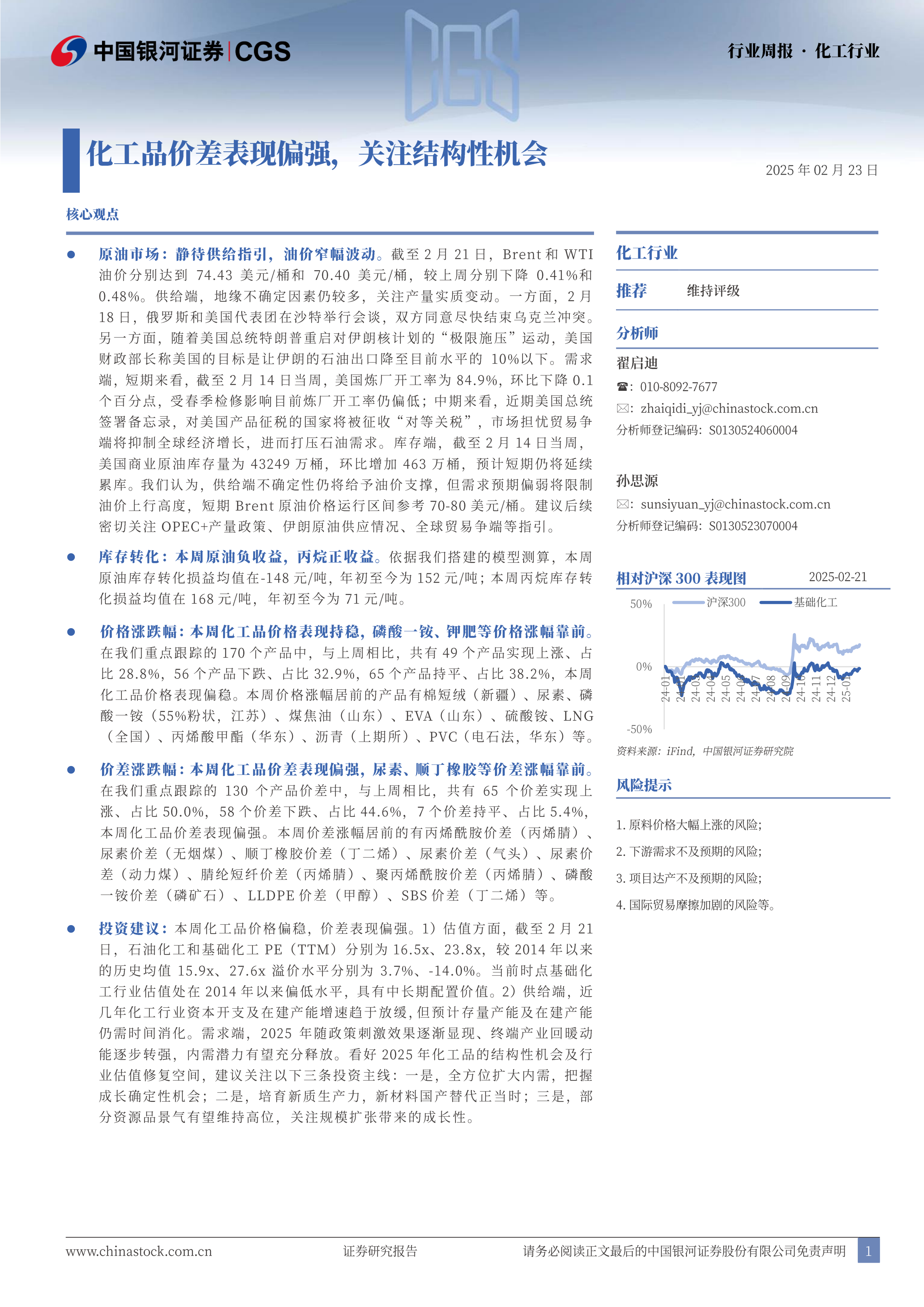 投资建议:本周化工品价格偏稳,价差表现偏强。1)估值方面,截至2月21日,石油化工和基础化工PE(TTM)分别为16.5x、23.8x,较2014年以来的历史均值15.9x、27.6x溢价水平分别为3.7%、-14.0%。当前时点基础化工行业估值处在2014年以来偏低水平,具有中长期配置价值。2)供给端,近几年化工行业资本开支及在建产能增速趋于放缓,但预计存量产能及在建产能仍需时间消化。需求端,2025年随政策刺激效果逐渐显现、终端产业回暖动能逐步转强,内需潜力有望充分释放。看好2025年化工品的结构性机会及行业估值修复空间,建议关注以下三条投资主线:一是,全方位扩大内需,把握成长确定性机会;二是,培育新质生产力,新材料国产替代正当时;三是,部分资源品景气有望维持高位,关注规模扩张带来的成长性。