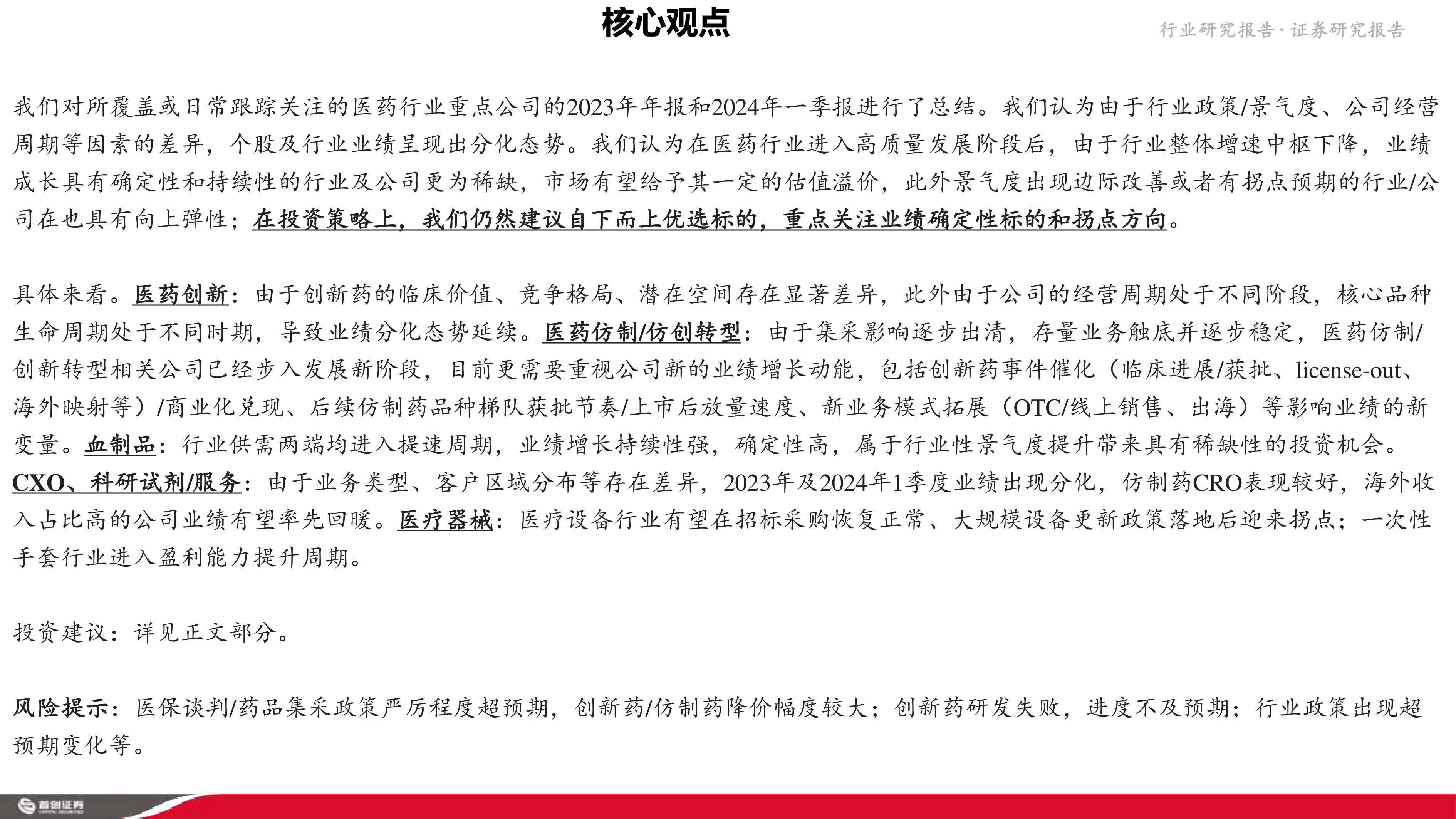 具体来看。医药创新:由于创新药的临床价值、竞争格局、潜在空间存在显著差异,此外由于公司的经营周期处于不同阶段,核心品种生命周期处于不同时期,导致业绩分化态势延续。医药仿制/仿创转型:由于集采影响逐步出清,存量业务触底并逐步稳定,医药仿制/创新转型相关公司已经步入发展新阶段,目前更需要重视公司新的业绩增长动能,包括创新药事件催化(临床进展/获批、license-out、海外映射等)/商业化兑现、后续仿制药品种梯队获批节奏/上市后放量速度、新业务模式拓展(OTC/线上销售、出海)等影响业绩的新变量。血制品:行业供需两端均进入提速周期,业绩增长持续性强,确定性高,属于行业性景气度提升带来具有稀缺性的投资机会。CXO、科研试剂/服务:由于业务类型、客户区域分布等存在差异,2023年及2024年1季度业绩出现分化,仿制药CRO表现较好,海外收入占比高的公司业绩有望率先回暖。医疗器械:医疗设备行业有望在招标采购恢复正常、大规模设备更新政策落地后迎来拐点;一次性手套行业进入盈利能力提升周期。