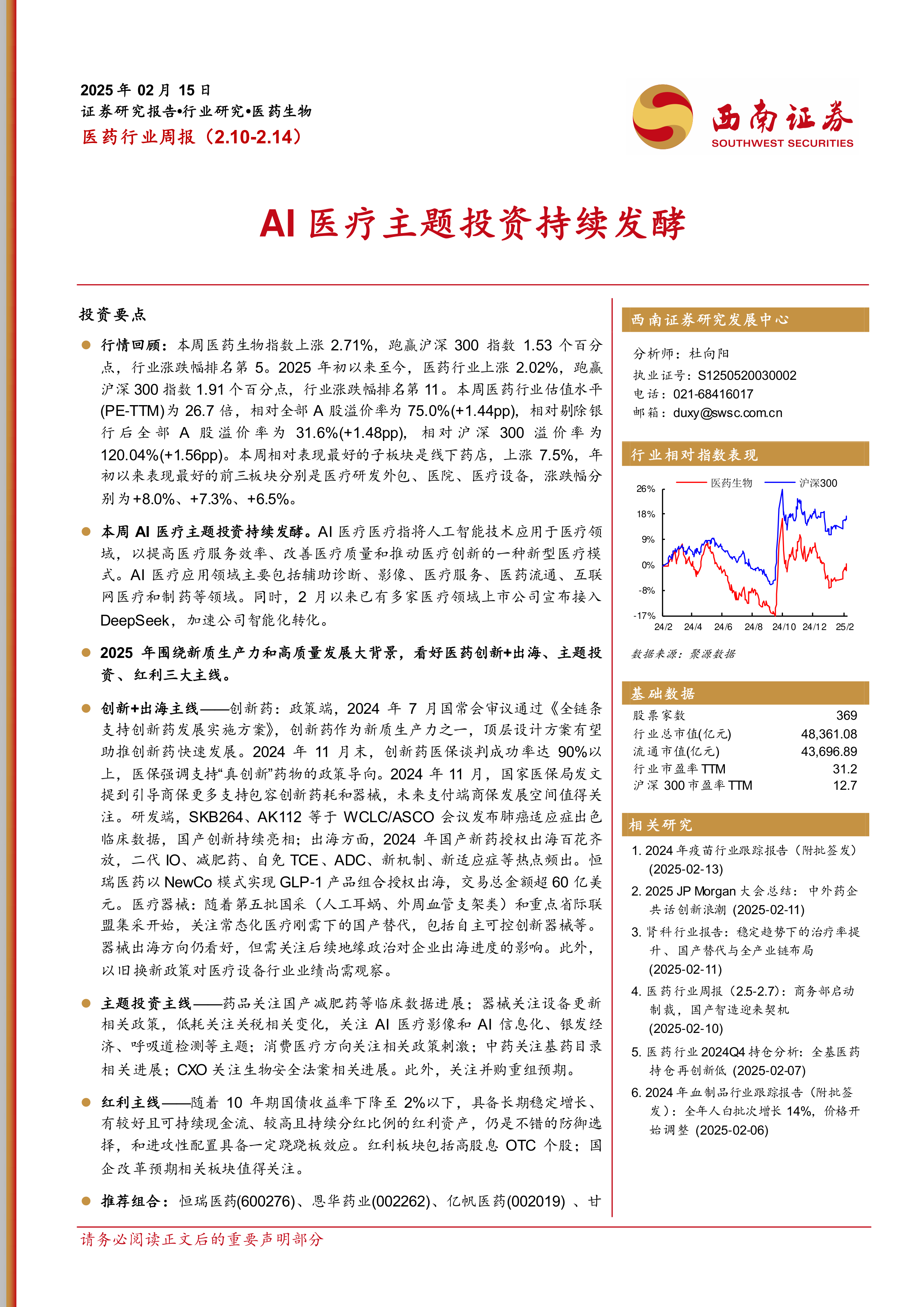 本周医药行业整体表现良好,AI 医疗主题投资持续发酵。报告重点分析了医药行业的三大投资主线:创新+出海、主题投资、红利,并提供了相应的投资组合建议。同时,报告还对市场交易情况、最新新闻与政策进行了梳理,为投资者提供了全面的行业分析。