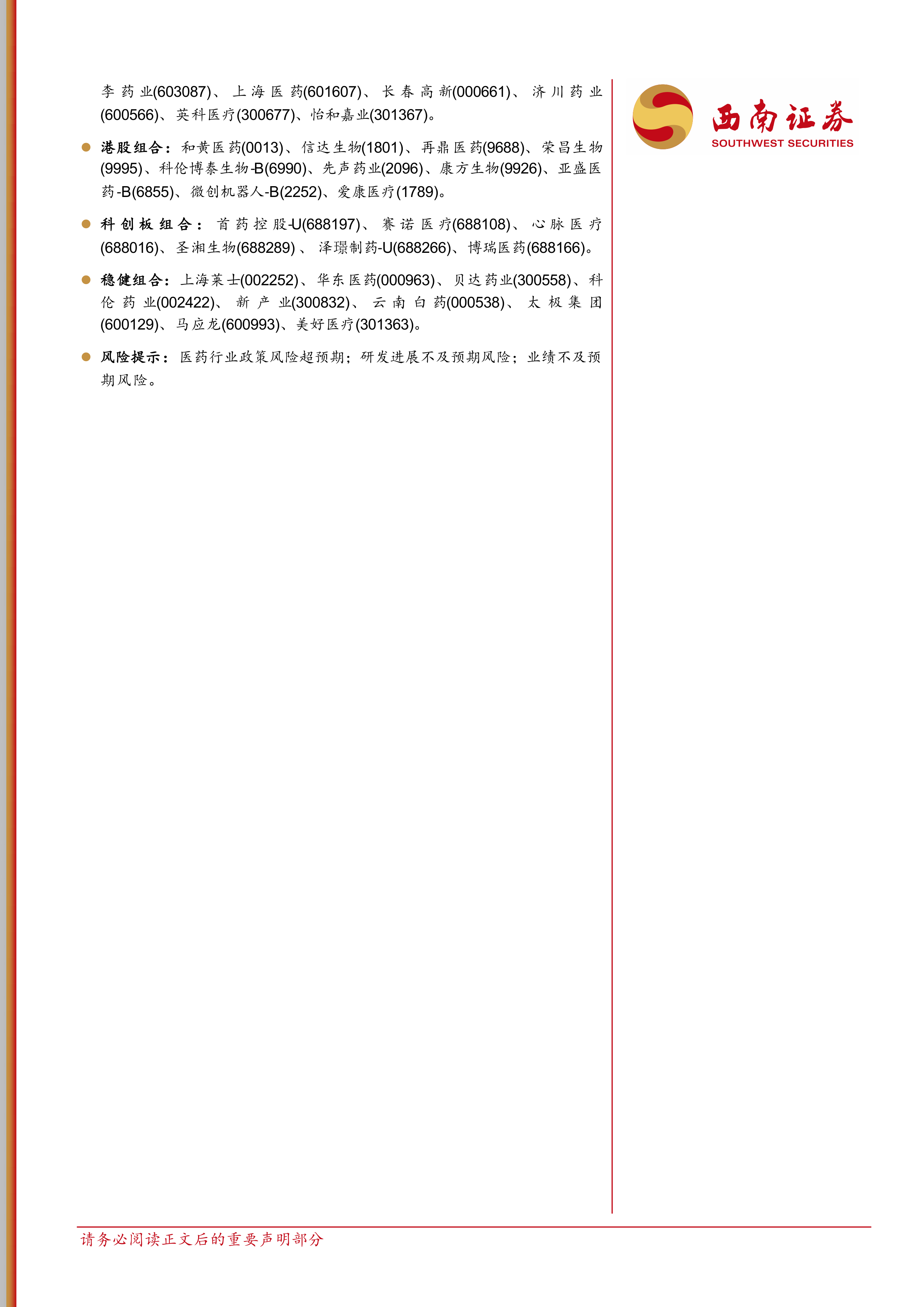 风险提示:医药行业政策风险超预期;研发进展不及预期风险;业绩不及预期风险。
