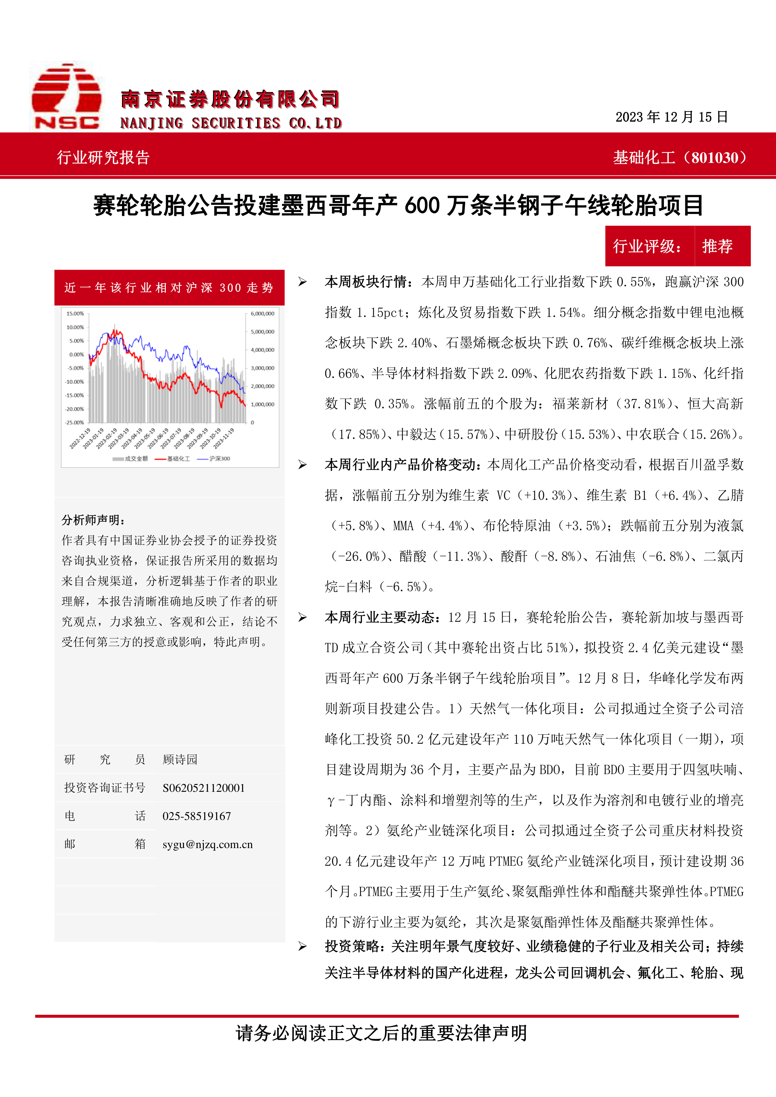 本报告对基础化工行业本周的市场表现、产品价格变动、行业动态和投资策略进行了全面分析。报告指出,行业整体表现相对平稳,但细分板块和产品价格波动较大。赛轮轮胎和华峰化学等公司的投资举措值得关注。报告建议投资者关注明年景气度较好的子行业,并提供了具体的投资标的建议。同时,报告也提示了宏观经济、下游需求和油价波动等风险。