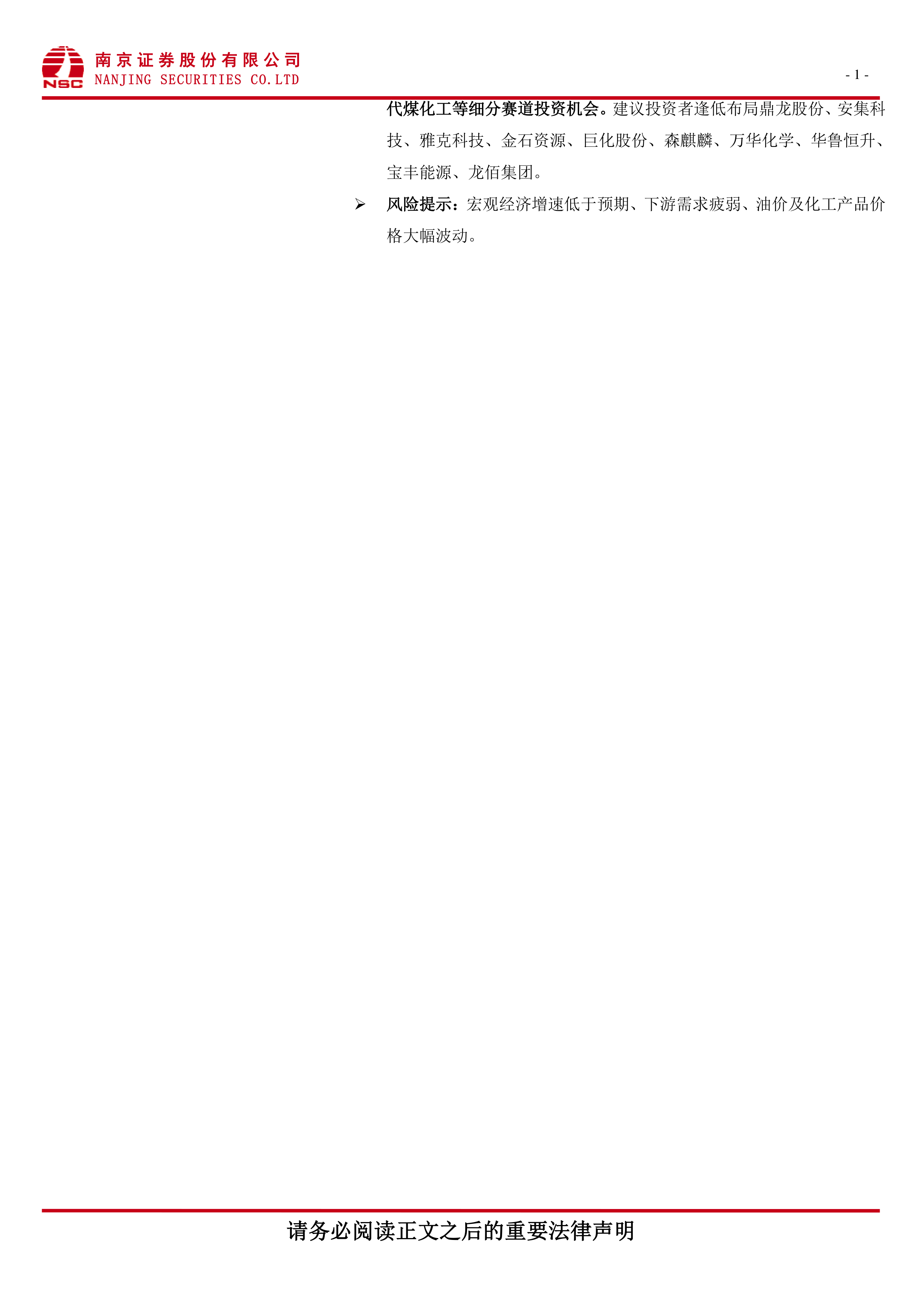 建议投资者逢低布局鼎龙股份、安集科技、雅克科技、金石资源、巨化股份、森麒麟、万华化学、华鲁恒升、宝丰能源、龙佰集团。