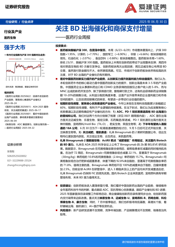 本周医药行业在震荡中复苏,创新药板块表现活跃,BD出海和产业催化受到市场关注。报告看好中国医药创新实力提升和创新出海的产业趋势,建议关注核心优势赛道和产业催化。礼来Bimagrumab的积极数据验证了ActRII靶点在“减脂增肌”方面的潜力。此外,医保目录调整、信达生物新药获批、荣昌生物和迈威生物的BD交易等产业动态也值得关注。