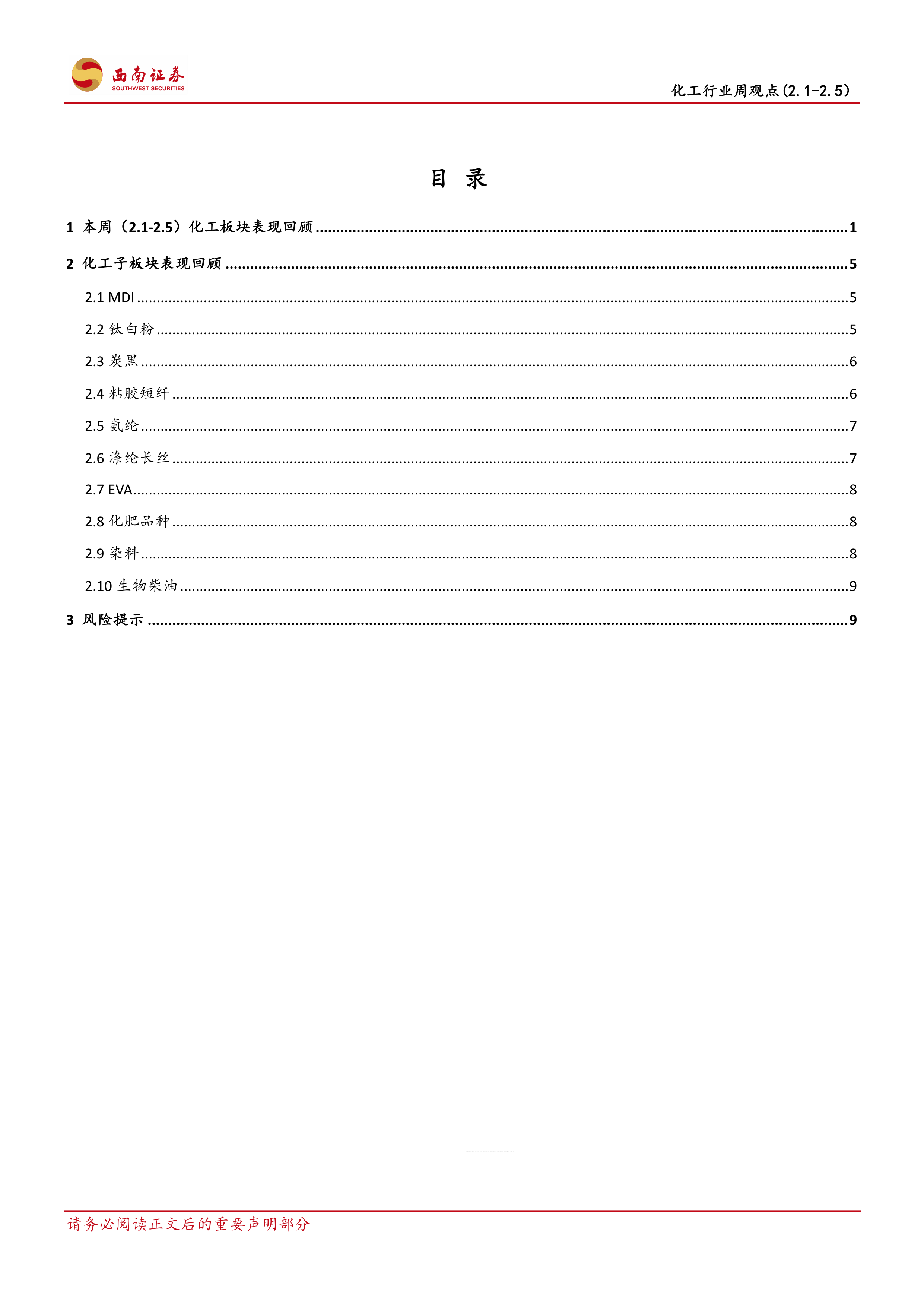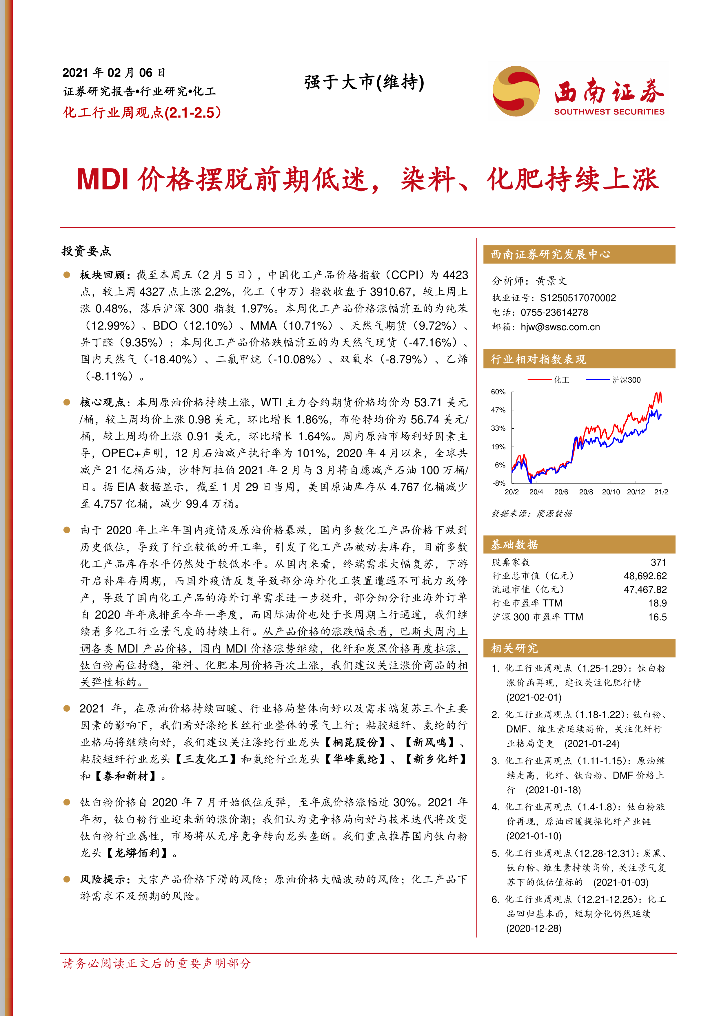 本报告分析了2021年2月1日至5日化工行业的市场表现,指出行业整体向好,并重点关注了MDI、钛白粉、炭黑、粘胶短纤、氨纶、涤纶长丝、EVA、化肥品种、染料、生物柴油等细分领域的市场动态。报告强调了原油价格回暖、行业格局向好以及需求端复苏对行业景气度的积极影响,并对相关上市公司进行了推荐。同时,报告也提示了行业面临的风险,为投资者提供了全面的市场分析和投资建议。