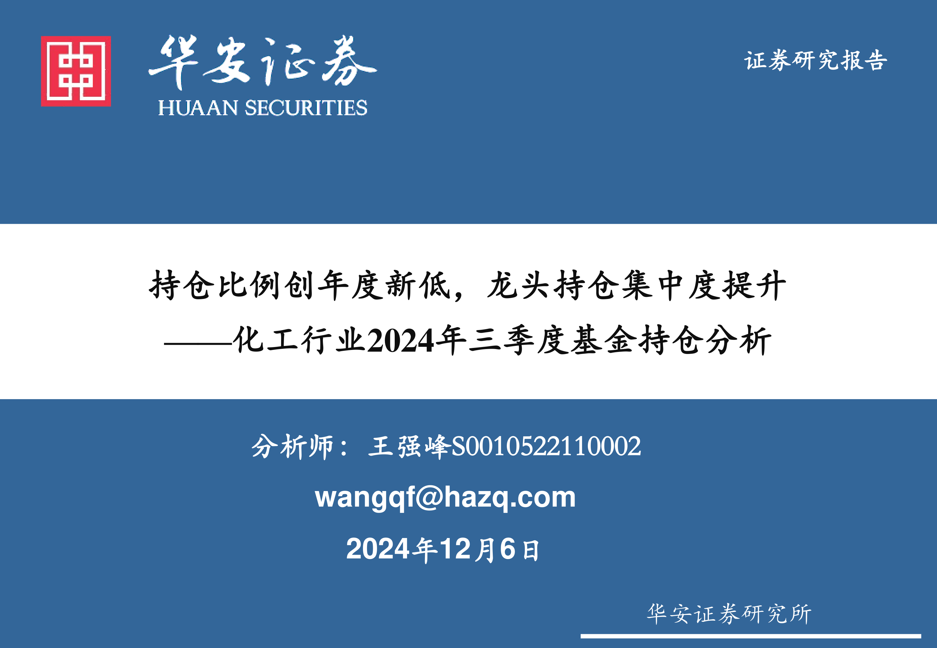 化工行业2024年三季度基金持仓分析:持仓比例创年度新低,龙头持仓集中度提升升析